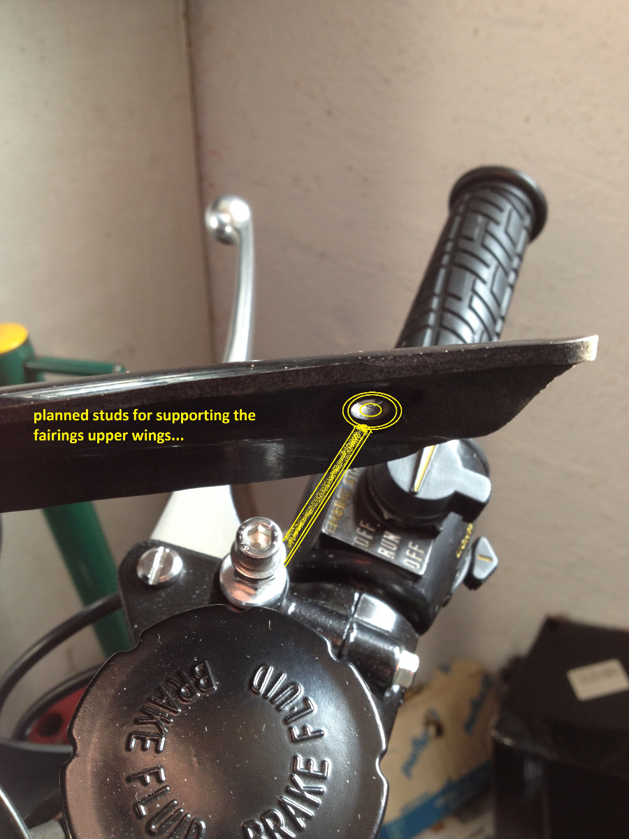 Today´s sunny, but about 0°C, also in the garages,..but i´ve done some little corrections on fairing alignment, by bending the brackets a little more , shorten the indicator studs, and measure out what i will need for the upper supporting studs,...now it´s close enough for me with the fitment about, i can live withit