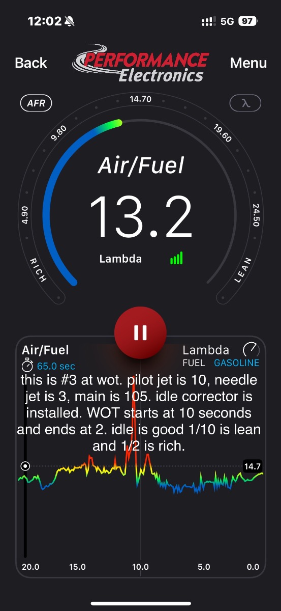 17 Nov 2025 16:20 - 17 Nov 2025 16:51It had 122.5 mains when i got it and a bunch of other jets that were way off. im now at about 105 mains. I uploaded the AFR curves (pictures) to chatgpt, told it where to look on the curve, and what afr i want. It took an afr of 9.4 to 13 in a single step. I could have jumped 3 jet sizes at a time, a couple of times, but im impressed by the time i was saved using AI. AI told me exactly what jets to put in each circuit, its just new and interesting.It seems you are over complicating this process. What are you going on about having AI analyze your curve for? Do you need AI to explain what circuit does what? You have limited choices to change in a carb and working with a stock motor + bolt ons shouldnt be a drastic change?