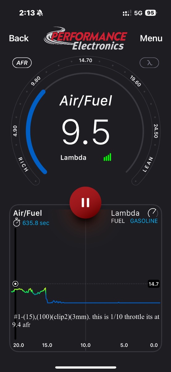 current settings#1-(15),(100)(clip2)(3mm)#2-(12.5),(102.5)(clip3)(3mm)#3-(10),(105)(clip4)(3mm)#4-(10),(105)(clip4)(3mm)recommended changes#1 needs less fuel at idle screw and 1/10. may need 12.5 pilot jet.#2 needs more idle screw and 1/10 fuel#3 maybe less main jet (102.5)#4 needs more fuel at idle screw and 1/10. It seems in a few cases 1/10 is mildly lean but idle is around 14 so I will bump idle down to 12 and maybe that will pull 1/10 down with it. the exact opposite may be true as well. I have a rich idle on 3 and a rich idle at 1/10. all of the AFRs pull right in at a little over 1/8 which leads me to believe I shouldn’t mess with the needles. 1/8 is where the needles take over from the pilot.