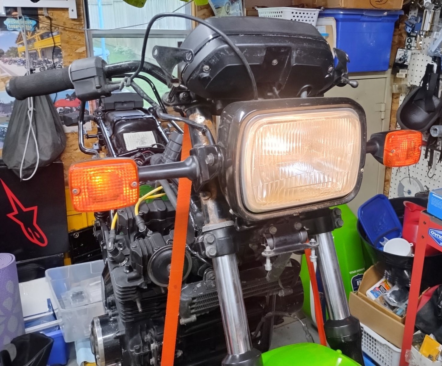 1978 KZ650 C2, 130K kms, Delkevic ex, EI, CVK32, PMC easy clutch, ATK fork brace, steering damper, braced swingarm, ZRX shocks, 18" Z1R front wheel.