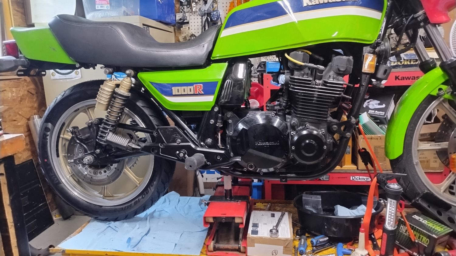1978 KZ650 C2, 130K kms, Delkevic ex, EI, CVK32, PMC easy clutch, ATK fork brace, steering damper, braced swingarm, ZRX shocks, 18" Z1R front wheel.