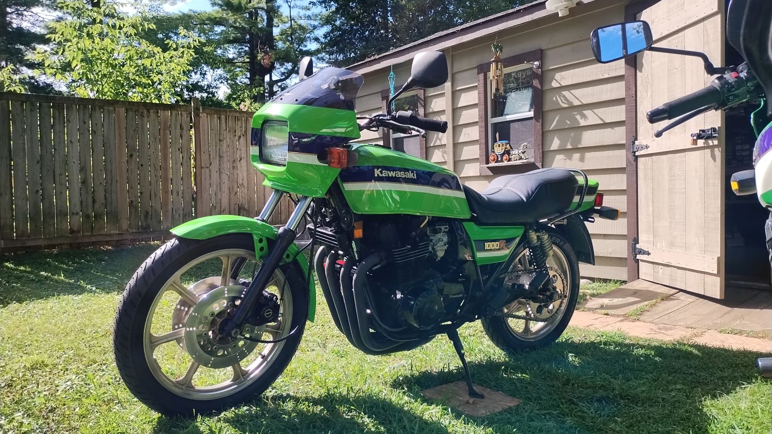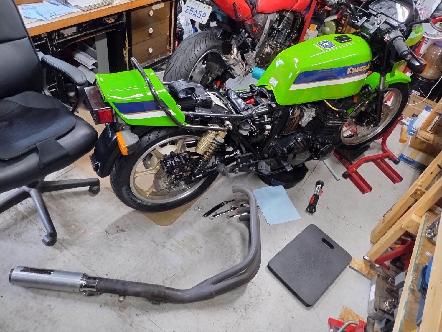 1978 KZ650 C2, 130K kms, Delkevic ex, EI, CVK32, PMC easy clutch, ATK fork brace, steering damper, braced swingarm, ZRX shocks, 18" Z1R front wheel.