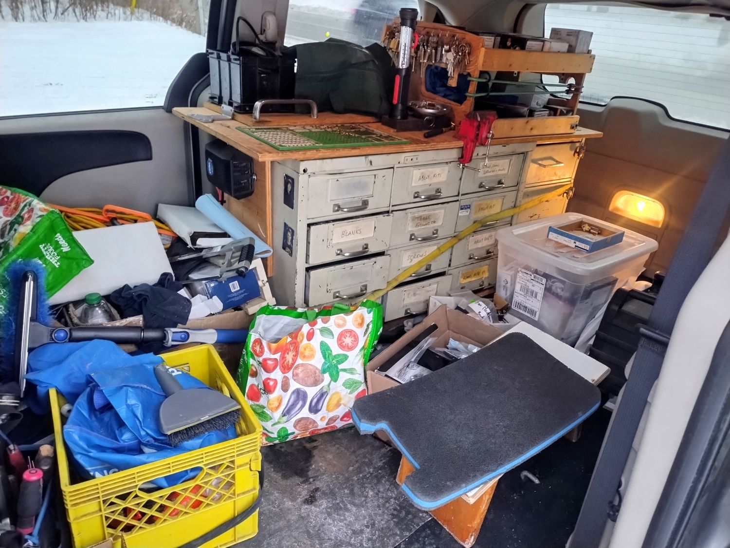 My current Dodge set up, a little messy and disorganized, but you can see how I've got a work bench.
