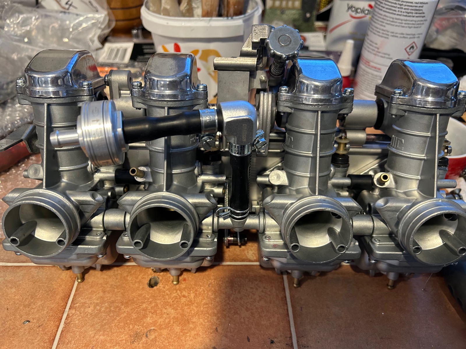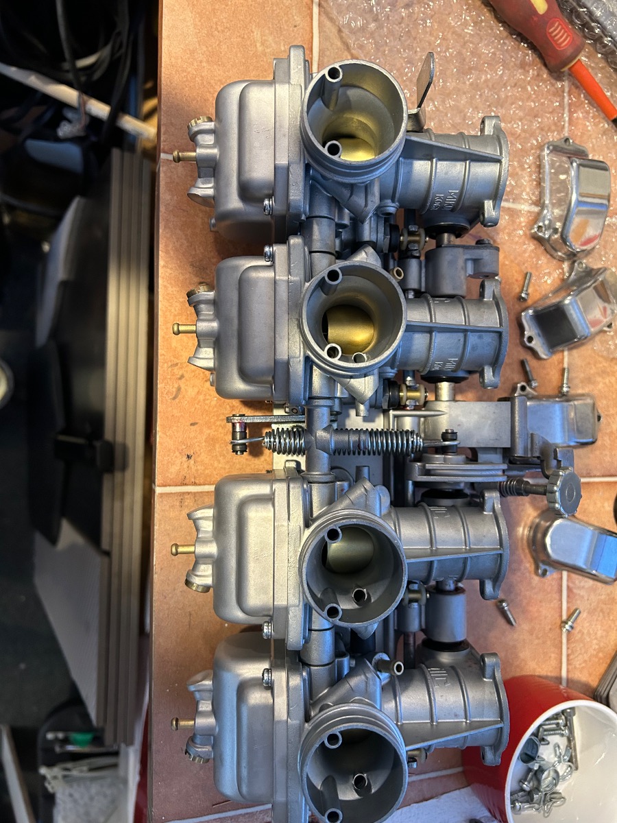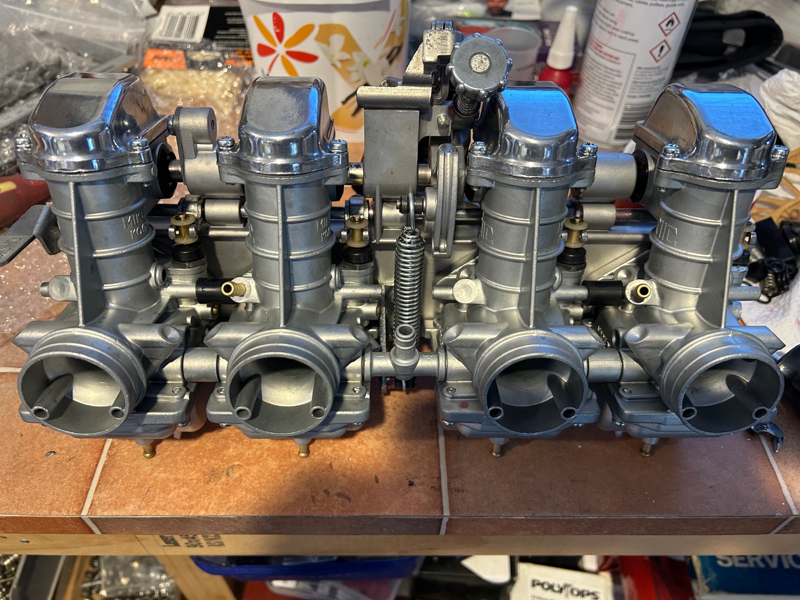 Decided to rebuild my carbs over the last week. They were generally pretty good, but not been rebuilt since new, still had original paint on screw heads. Pulled apart, vapour blasted and replaced jets, seals etc. set float heights using the wet method and jar on each carb, set the bench sync throat gaps to 0.7mm and refitted.