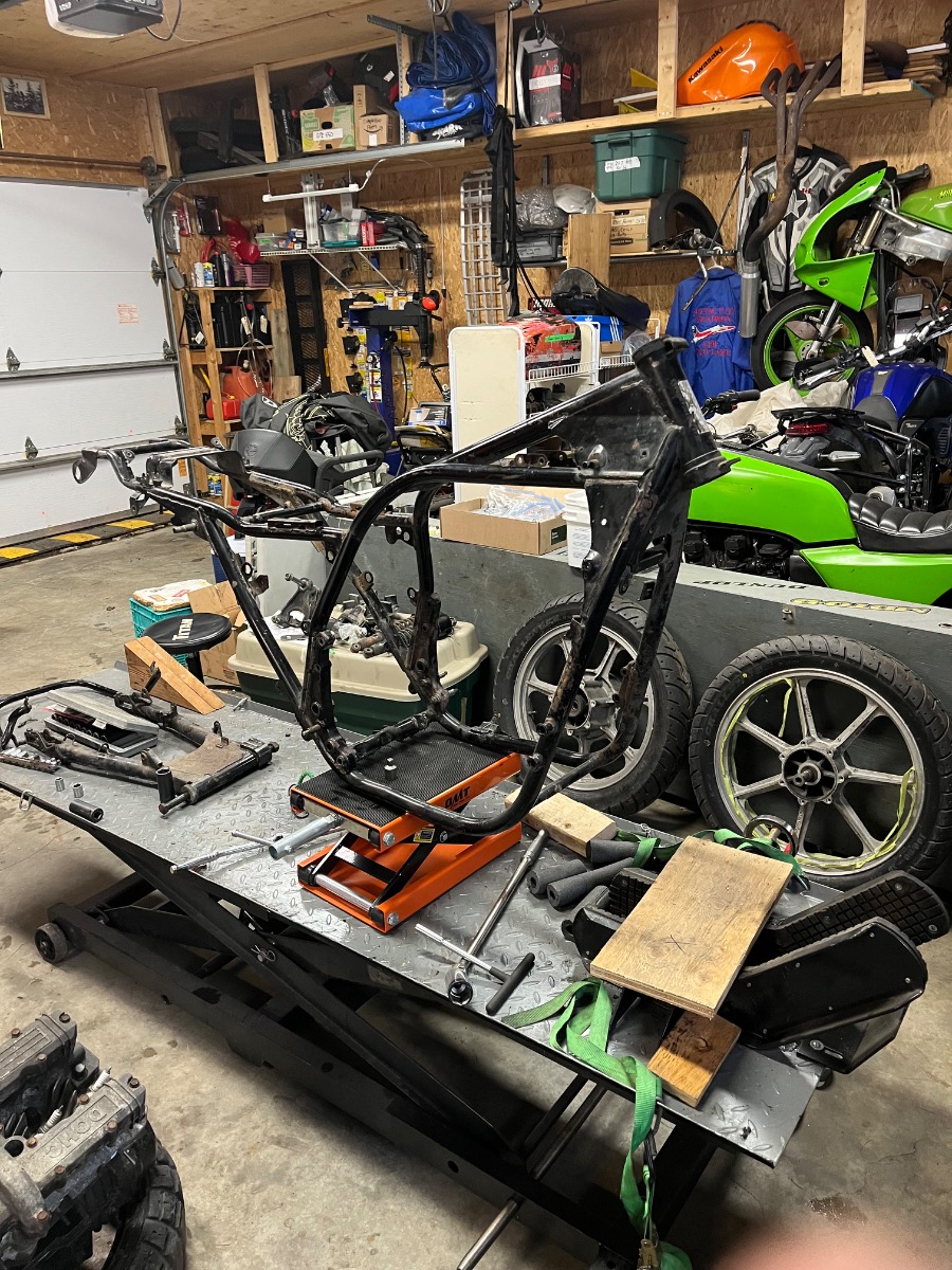 I now have the bike stripped down to one piece and ready to go for sandblasting.