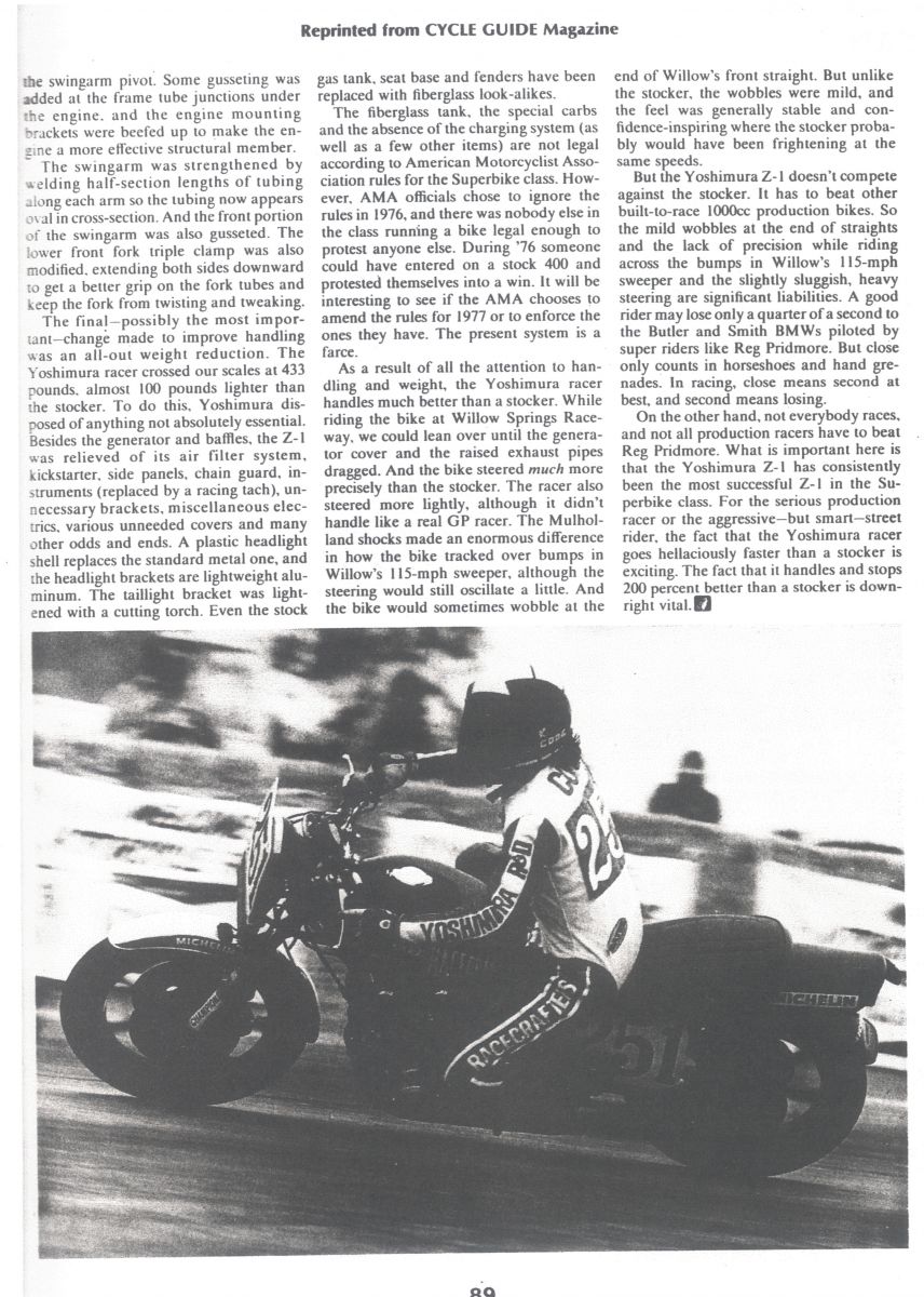 Here's a scanned copy of the Violence on the Racetrack: The Yoshimura 1000cc Z1 Racer article by Art Friedman that appeared in CYCLE GUIDE magazine in '76 or '77.