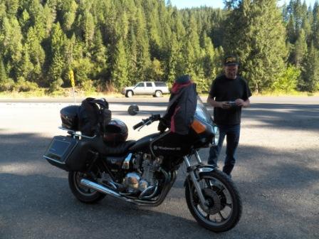 Otherwise, it was real nice of Mike in Bend to ride up on Saturday night to tell me of Kaw-a-holic's crash. Let me know he was ok, but the bike smashed up. So I started to wonder if I could still meet up for a Hand-off. I had 0 cell reception out in any of this ride, don't use Virgin Mobile, so I asked the camp host, he has Verizon which worked. So I started leaving messages on Kaw-a-holic's phone about a meet still. Then on Sunday, I broke camp before the first Sparrows Fart, and rode. Keep trying to get reception, in the direction of Montana. When I got to Cambridge, ID on the 95, I was at a gas station that was closed, and an old retired 93 year old rancher drives up to me and asks me if i need gas. I said no I need a phone, and he offered his, also offered use of his computer back at his ranch. Nicest guy you'll ever meet. So that way I left a message here on KZR, also a PM to Kaw-a-holic, and also called him again. Then kept riding in his direction in hope this would work. Finally got a hold of him about 11:00am Pacific time,and I was about 25 miles from where he dodged the Deer. Then he agreed to come part way back to Idaho from Montana. Well there was some confusion, I went to far, in fact into Montana, turned around and went back. He was waiting, thankfully, as there is no cell service out there along that gorge. So once we made the hand-off and talked a bit, I turned and burned, riding all the way back to Cambridge that night. Then from there through Hell's Canyon up through Baker, onto the 7 SW to the 26 into John Day to meet up with Gary.