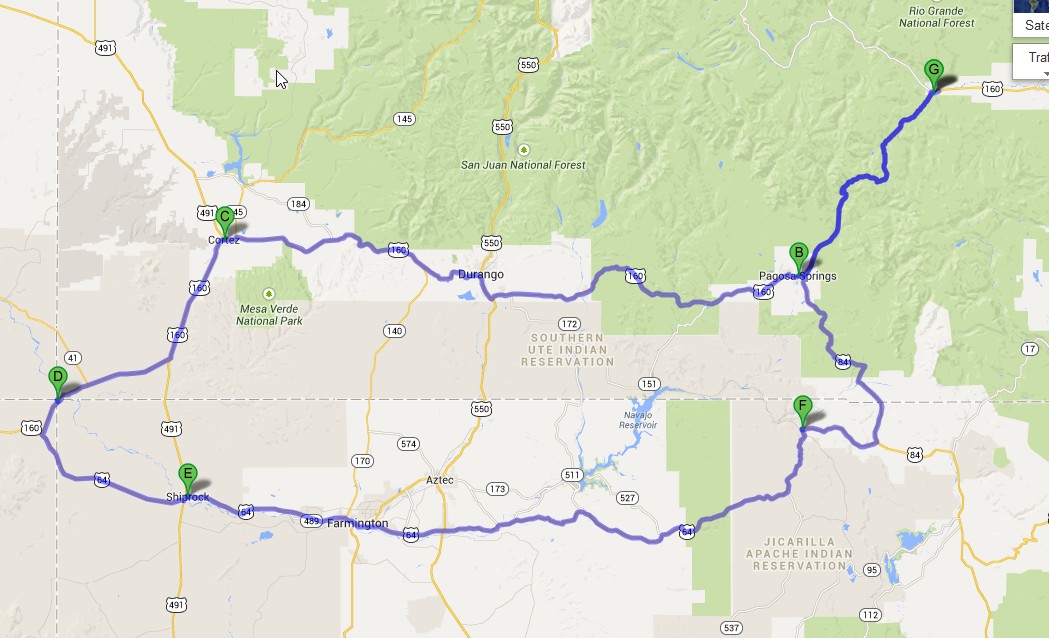 Then the next day we did about 430, riding over to Cortez to meet Paul (Baldy) with the Flag. Then we all took the Flag to 4 corners to touch it into AZ. Then quite a ride back that afternoon to South Fork and the Lodge. We went down into NM and through Farmington up and over a different pass trying not to repeat to much ground. That turned into a bit of a speed fest, running along at a brisk pace. My buddy Dave and his CBX out front, the guy can ride fast and make it look like he's doing 40. goo.gl/maps/ze8PN