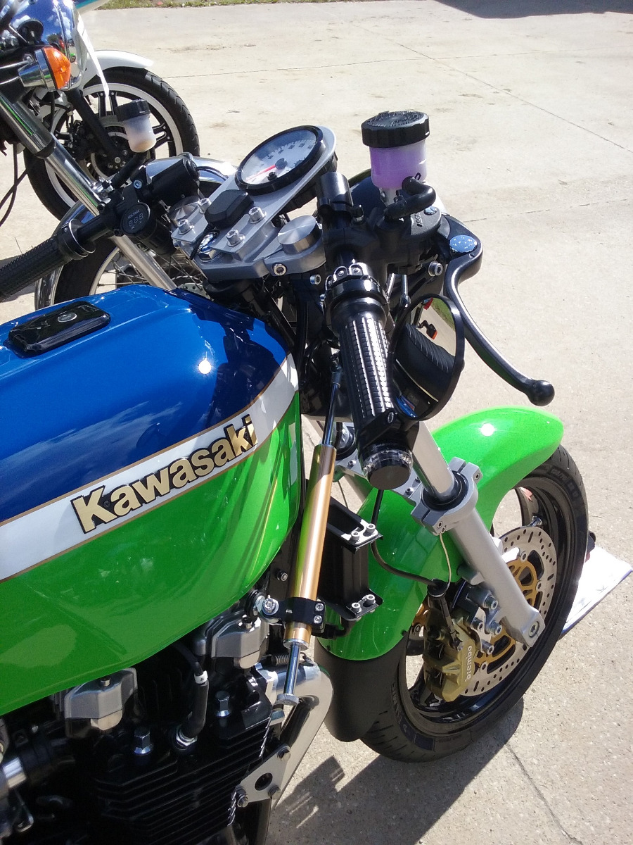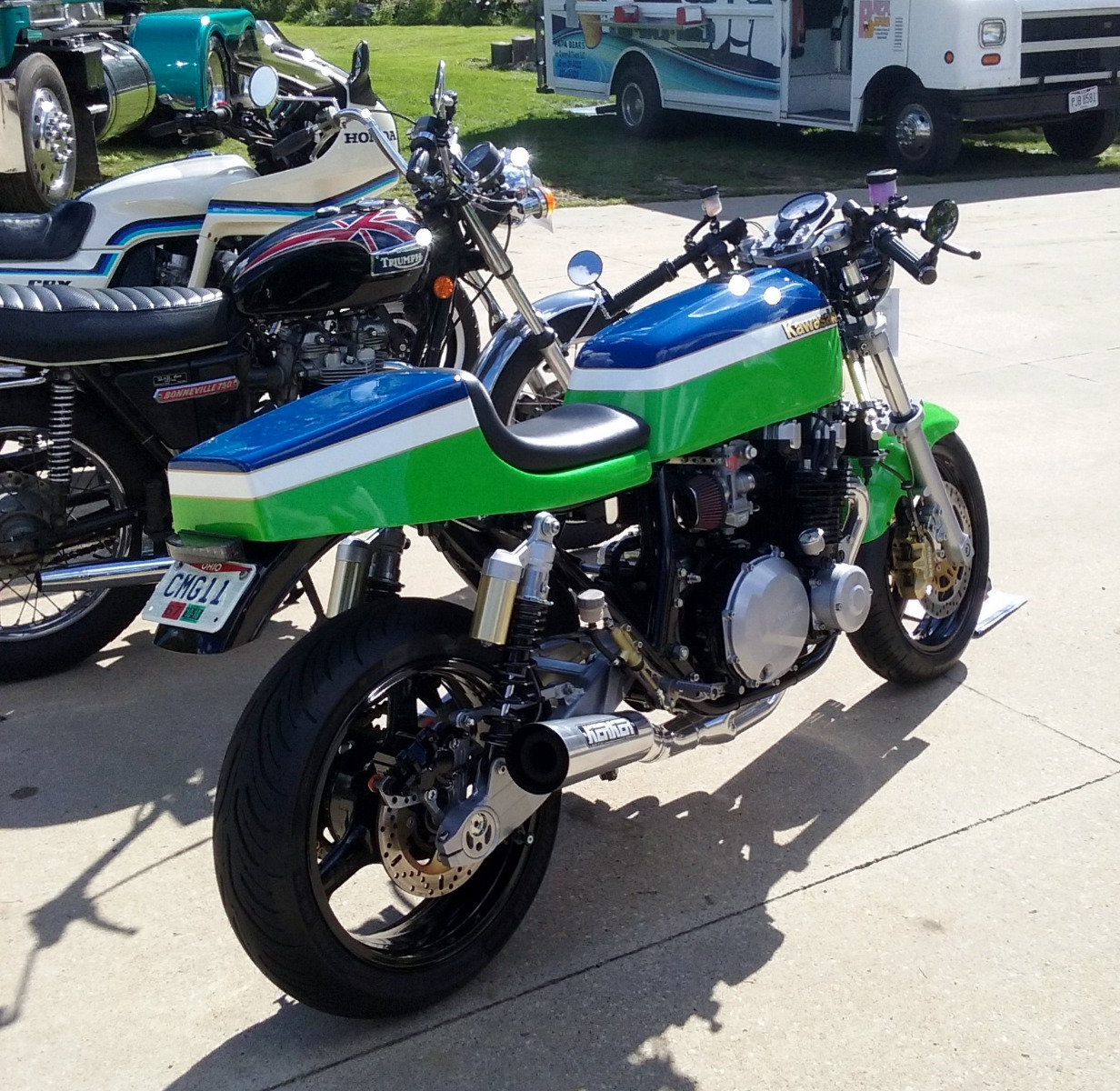 Thank you.Here is some info.I completed in October of 2017 which took almost 2 years to complete. The winter of 2017-18 I did some updates. On this build the only original parts I used were the original main frame(slightly modified)and original engine which had 4,507original miles, coil brackets, engine mounts, seat pan(slightly modified),seat lock, both rear fenders(slightly modified),headlight lens, Igniter and Pulse coils. It now weighs 479lbs. with 4.5gals.of fuel, including almost 3/4 quart of additional oil. Stainless fasteners used throughout. Engine was cleaned, prepared and painted with ceramic high temp. 2K paint. Powder coat was used throughout the build. Custom pieces I made.Every part is new or refurbish to as new condition with no exceptions.The following donor motorcycles were used:2000Kawasaki ZR750,2000 Kawasaki ZRX1100,1993-98 Kawasaki Zephyr 750,2013 Kawasaki ZX14,2000 & up Ducati,1985 & up Honda Rebel 250,This motorcycle is a comfortable, fantastic ride with performance up-grades and less weight.