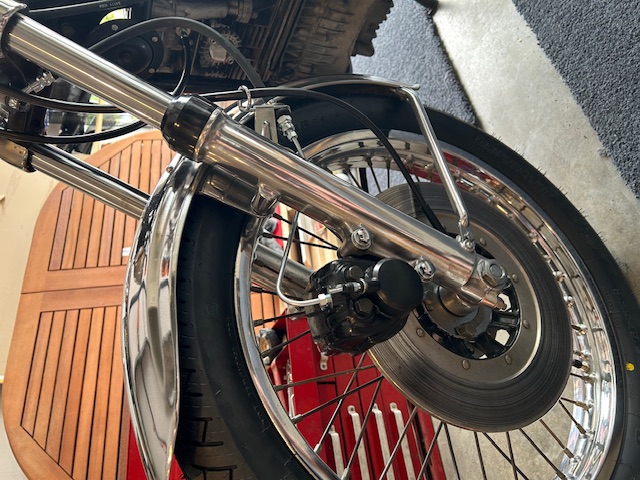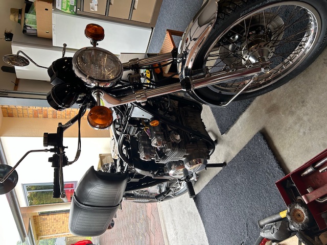 I have replaced the tyres with Bridgestone’s, original size, and gone for an x-ring chain, genuine cables and hoses etc. The wiring is all good, charging properly, and everything works as it should.. The exhaust was in great condition apart from someone had polished it with emery cloth, and the resulting scratches would not polish out, so had to re-chrome it. Re plat ed the nuts, bolts and washers. All of the indicator assemblies, front and rear lights are original, but had to replace the headlight as it was American spec and pointed the wrong way for NZ roads.