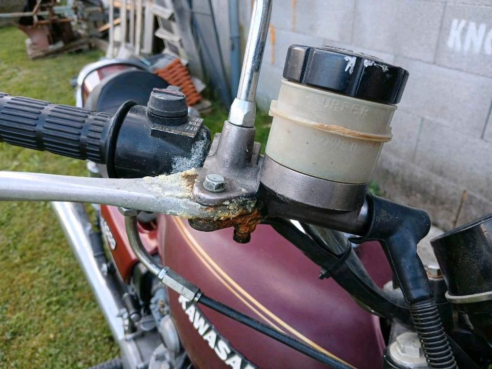 1978 KZ650 C2, 130K kms, Delkevic ex, EI, CVK32, PMC easy clutch, ATK fork brace, steering damper, braced swingarm, ZRX shocks, 18" Z1R front wheel.