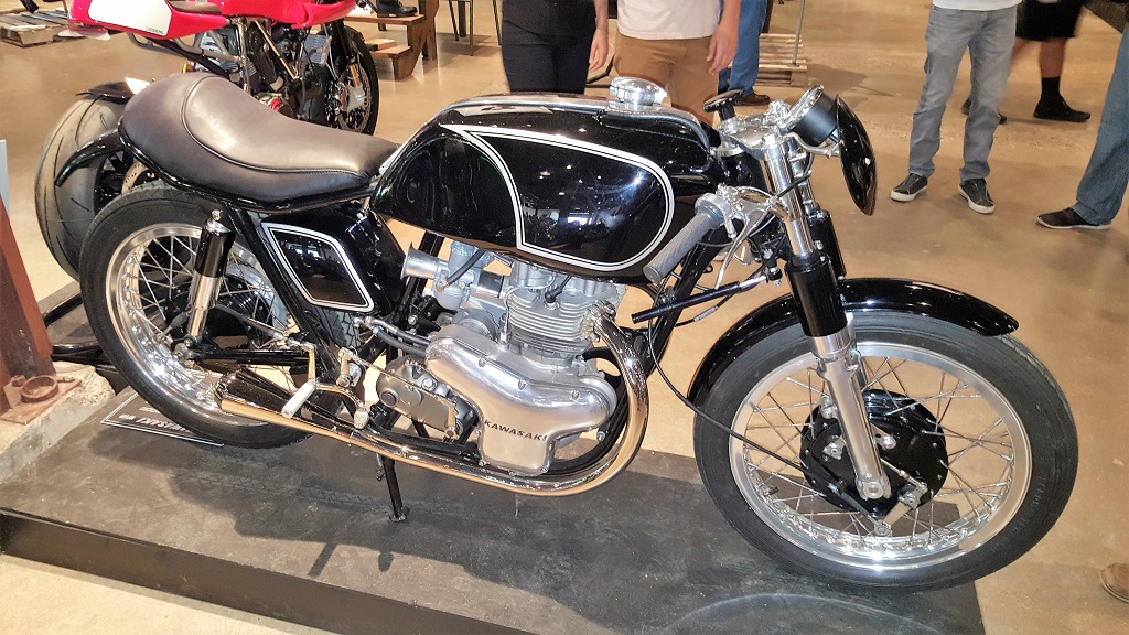 So many awesome machines on display. Some on the walls literally and most on raised plinths kinda' grouped in similar esthetics. I kept ogling and sipping, cafe bikes, brat-styles, ultra rad one-offs, Ducati, Norton, Honda, Yamaha RDs, Harley Davidsons, Indians (old and new). All very clean and cool regardless of your personal taste. But wait. Whiskey Tango Foxtrot? Is there not a Kawasaki in the whole dang place? Tell me that none of these younger, hip, guys we hear on the forum here or any like minded, daring guys with a cutting torch and angle grinder haven't targeted a KZ?