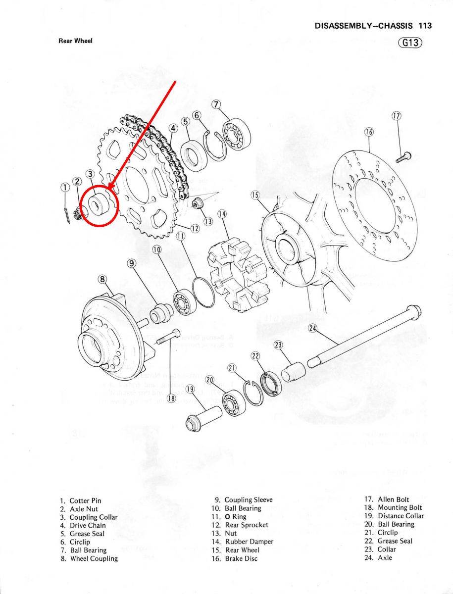 Keep in mind this came to me in not running condition. I've installed the 106 link chain, perfect fit. When I reinstalled the rear wheel assembly I noticed the wheel started to bind when the axle bolt approached tight. Spec is 87 lb ft and I'm talking about an approximate 15 to 20 lb ft of torque. On closer inspection is looks to me like a collar is missing on the left hand side. It is part 92027A in the explode view from Partzilla in the attachment. There isn't a collar on the bike, I can see what looks like a typical rubber seal that should ride on the collar, and the grime I'm looking at suggests it hasn't been on in a long while. Can anyone confirm something is missing. The service manual indicates the axle assemble/layout isn't unique to the GPz.