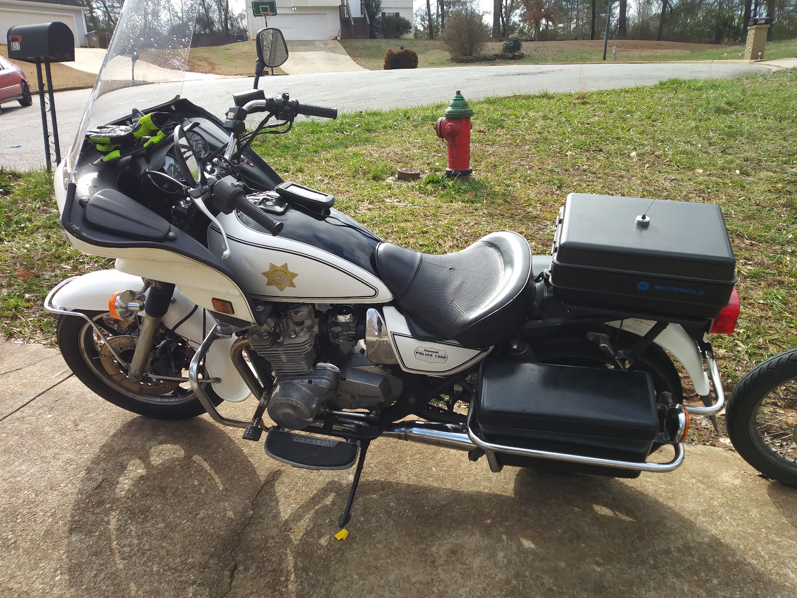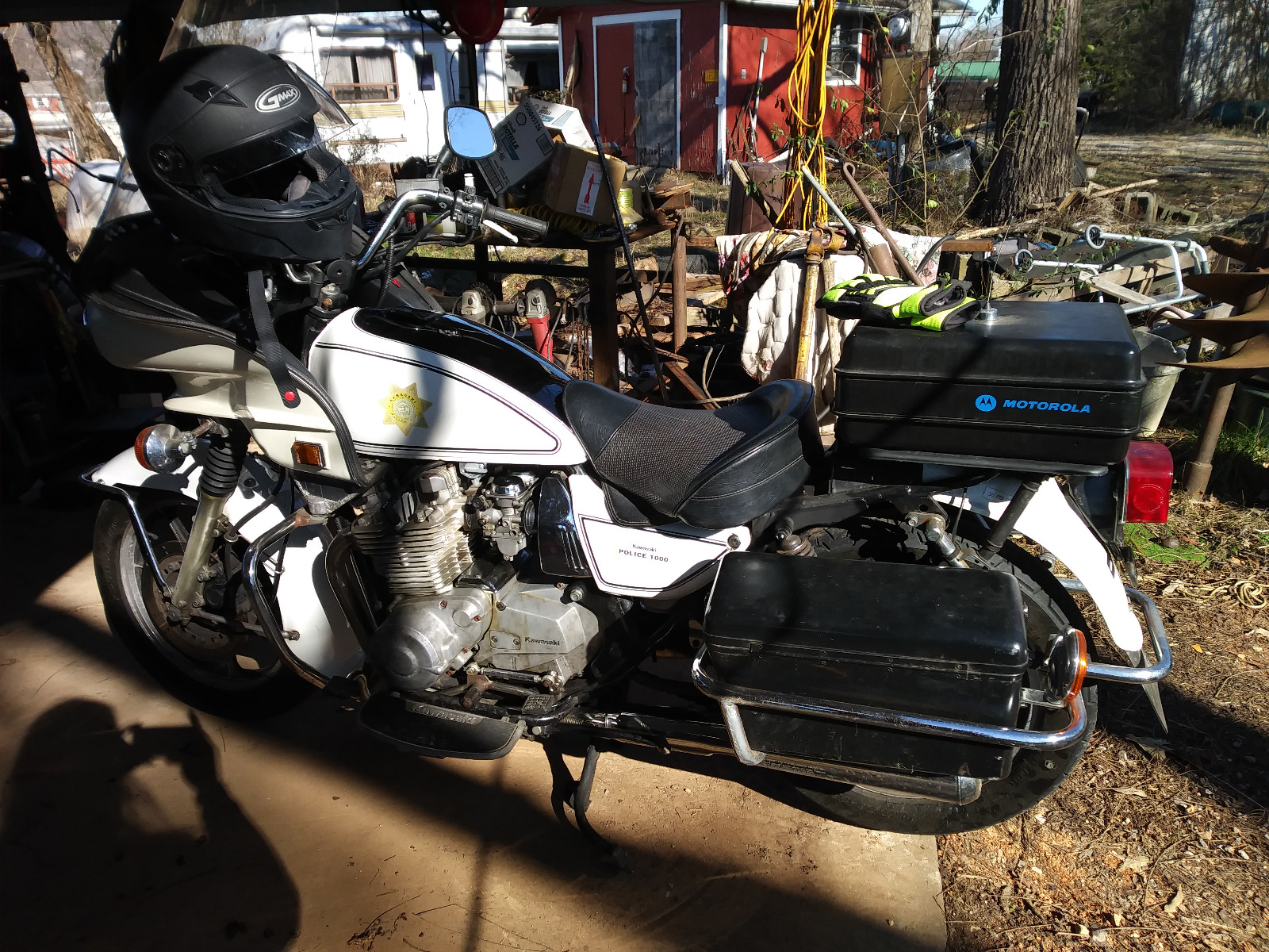 The above photo showing the bent frame is at a friend's house in Knoxville the day I bought the bike. We went over it with a fine tooth comb... tire pressure, chain slack, wheel alignment, triple tree and fork alignment, went over every switch and electrical bit, and found some electrical glitches. When I can, I'm going to try to find some NOS hand controls because I have rather dorky, but perfectly legal plans for the siren and pursuit switches. Basically gonna hook up speakers so the siren switch plays the CHiPs theme song on demand.