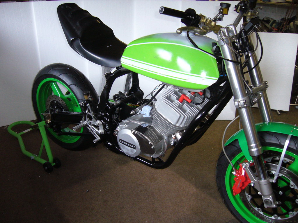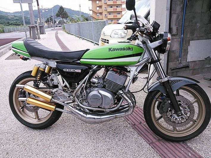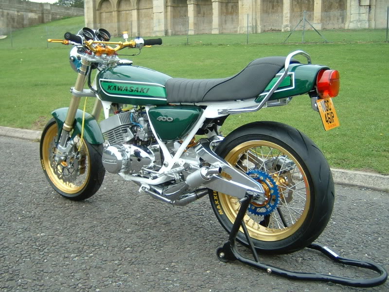 The KH400 and the S3-400 triples were the best handling of all the Kawasaki triples. The '76 KH400 was the first of the small triples to have electronic ignition instead of those poor performing points ignitions!!!! I used to production road race a '76 KH400 back in '76 to '78. I still have a notebook full of things that worked, and things that did not. I was one of the few people that raced the KH400 instead of the very popular Yamaha RD350 and RD400 in the 410 Production class. There would be 25 to 40 or so RD's and me on my KH400 at most races back then!!!