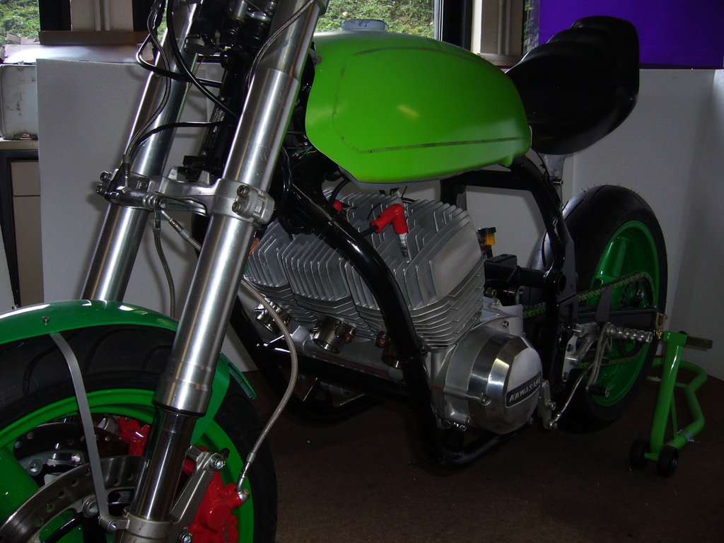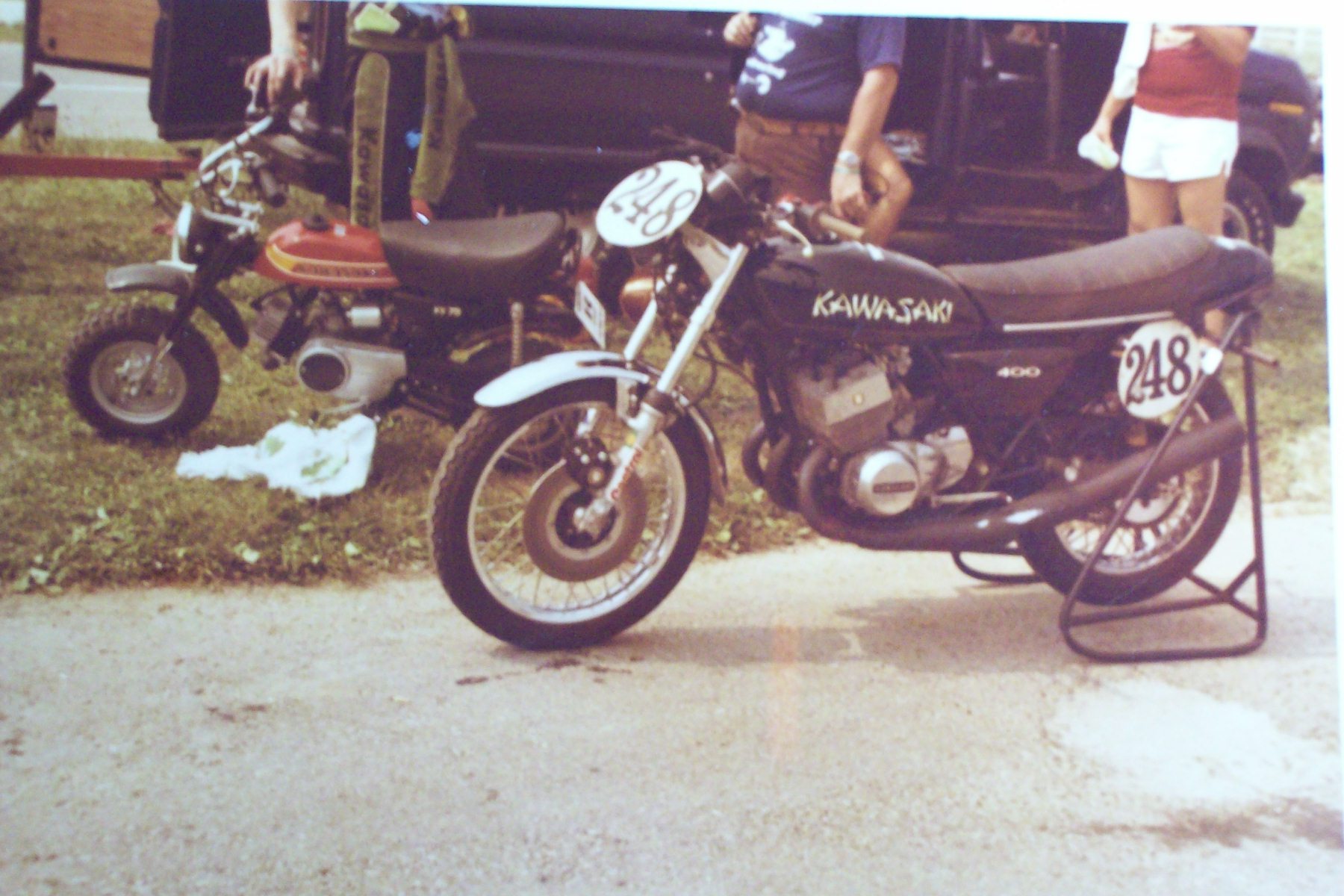 A few small hints for you on the KH400. Ditch the clubman bars, and go for a set of Superbike bars instead of those bars. The closest I ever came to crashing without actually hitting the ground was when I had clubman bars on my 400. I went into a lock to lock high speed wobble and I just did not have the leverage with those bars to stop it!!!! A steering damper is a MUST on any triple too!!!! Switch to a high quality synthetic two stroke oil, and stay with that brand. Don't go mixing different brands of oil. You can back the oil injection pump way off when you use synthetic oil instead of cheapo two stroke oil. NGK spark plugs only. I ran B9HS on track, and B8HS when I rode it on the street. Transmission oil, I used Ford type ATF just like Denco recommended so your clutch doesn't slip at high rpm's. If you use a heavy gear oil, I guarantee the clutch will slip!!! Been there, done that!!! With those chambers you should have heavy duty clutch springs too. I ran the H/D clutch springs even with stock pipes. My little "stock" KH400 ran at best 13.71 to 13.91 at 102 to 104MPH in the 1/4 mile back in the day.