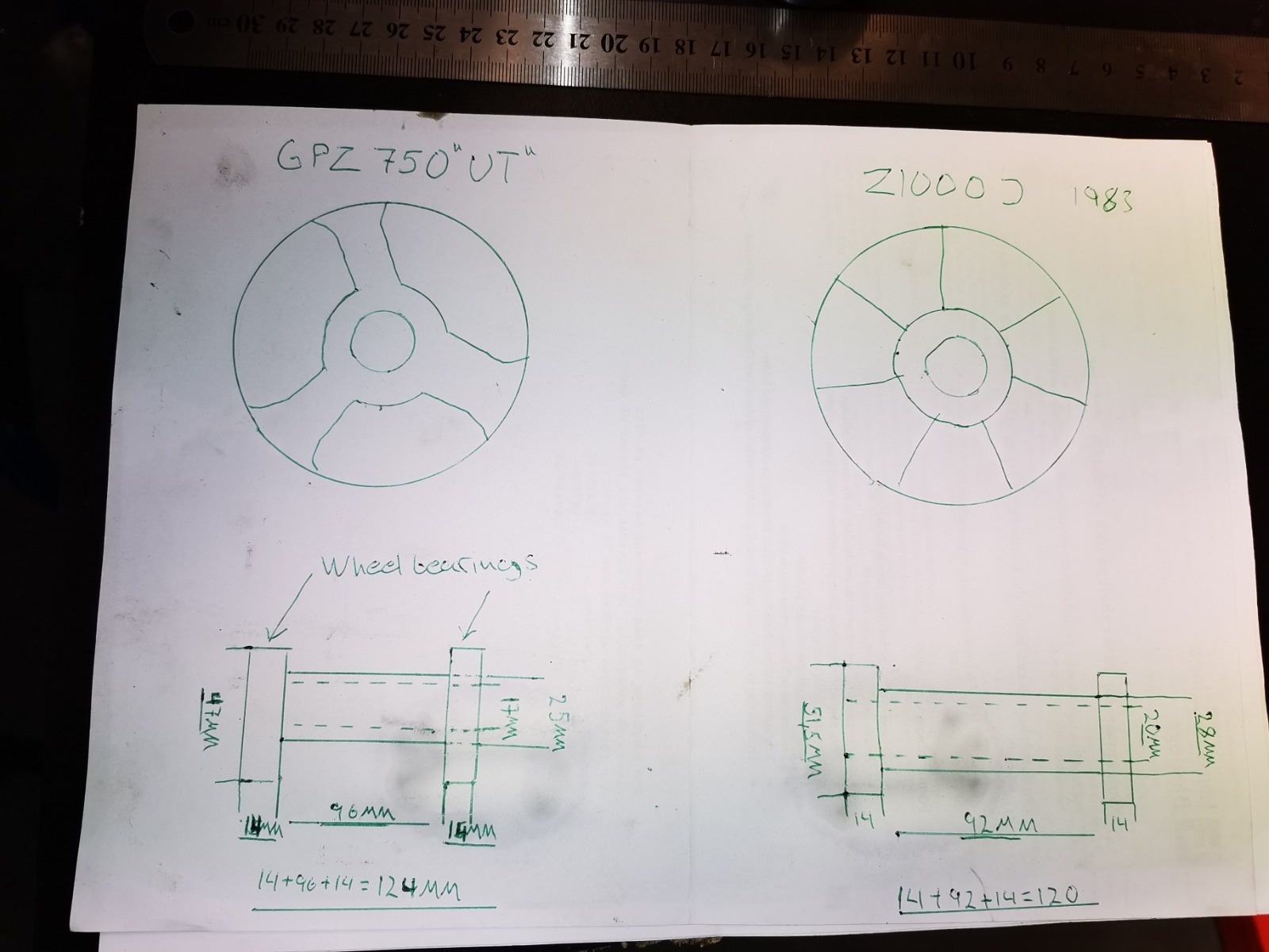 I am having some trouble with my rear wheel. I bought a set of Gpz750UT wheels, and the dimensions doesn't line up at all with the rear wheel...