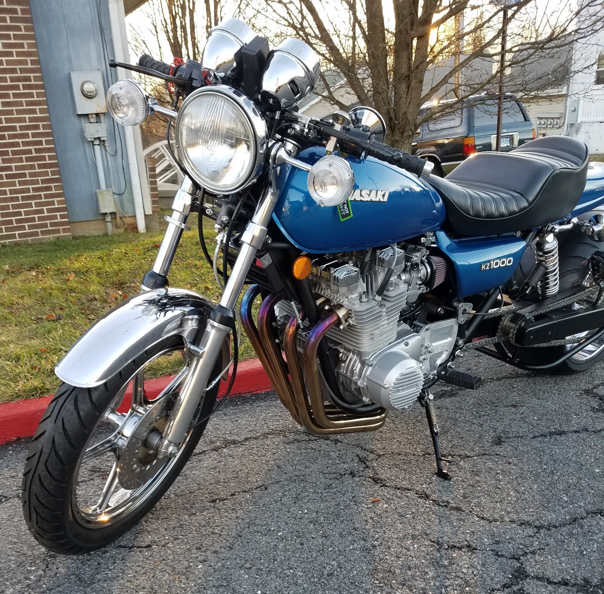 Actually, once I get the muffler done, it's done. I did from bare frame chemically stripped and powder coated. Every small piece powder coated or chromed. Every nut, bolt, washer replaced with stainless or titanium. It's an absolute new 1977 KZ1000. Even front wheel was from a EX305 that was painted stock. It was sent to Paul's chrome and $600 later it with the brake setup took almost 9 pounds of of the front end. Measured and measured to get all to work together.