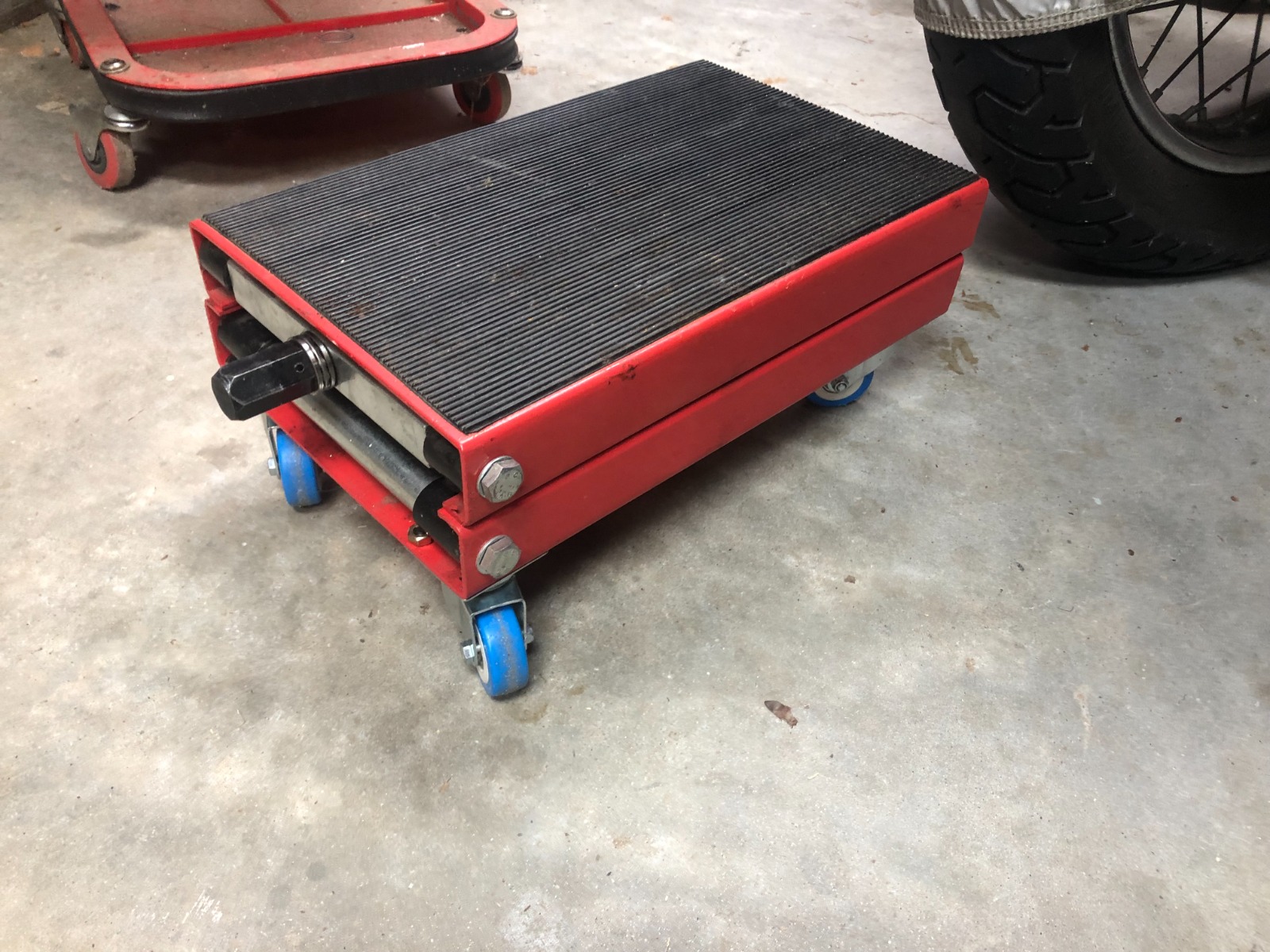 It's a Harbor Freight hydraulic lifting table - 500lb capacity. (They have a 1000lb version, too.) Right now one is holding a Yamaha XT250 and one is an engine stand.