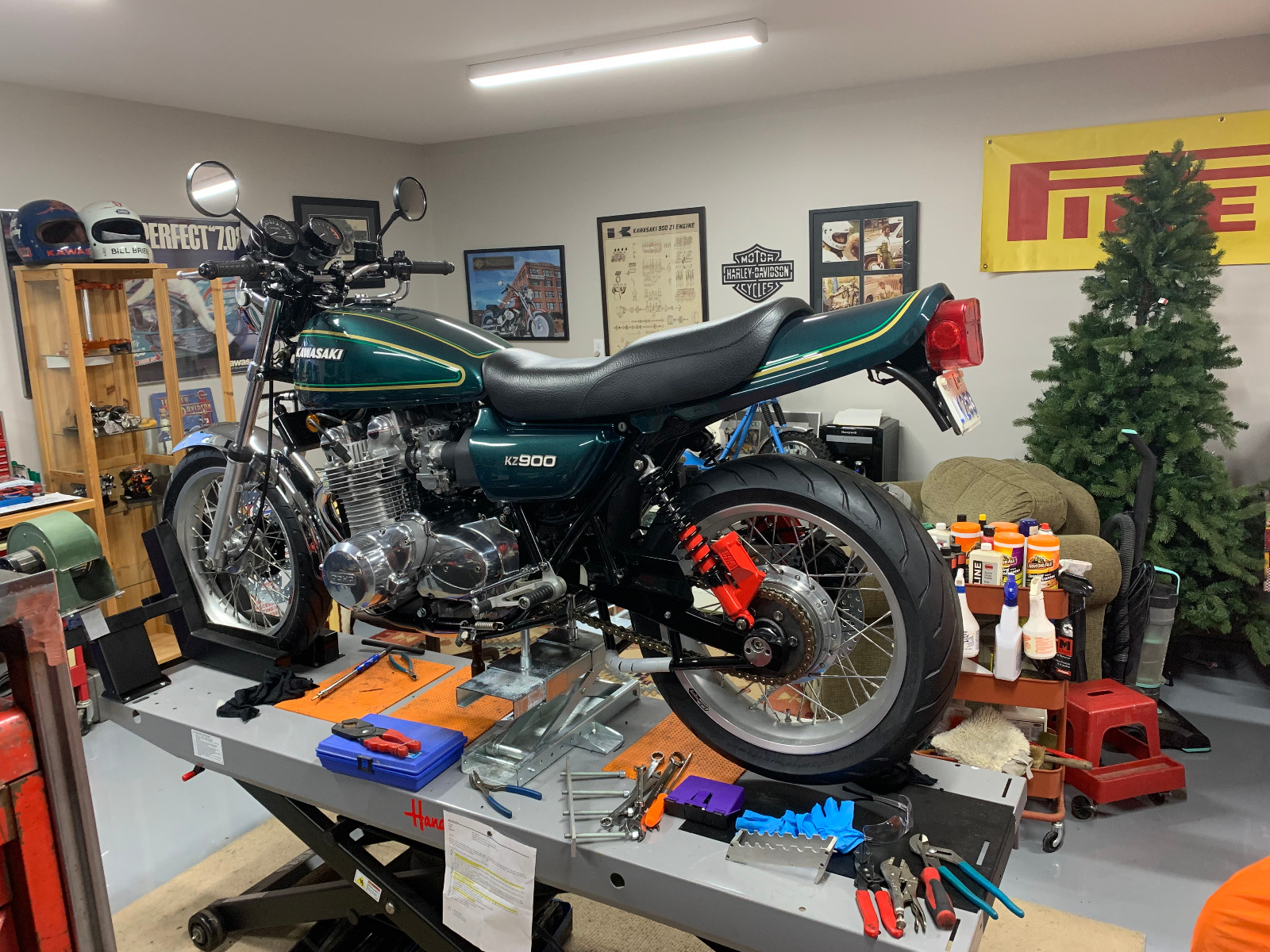1978 KZ650 C2, 130K kms, Delkevic ex, EI, CVK32, PMC easy clutch, ATK fork brace, steering damper, braced swingarm, ZRX shocks, 18" Z1R front wheel.