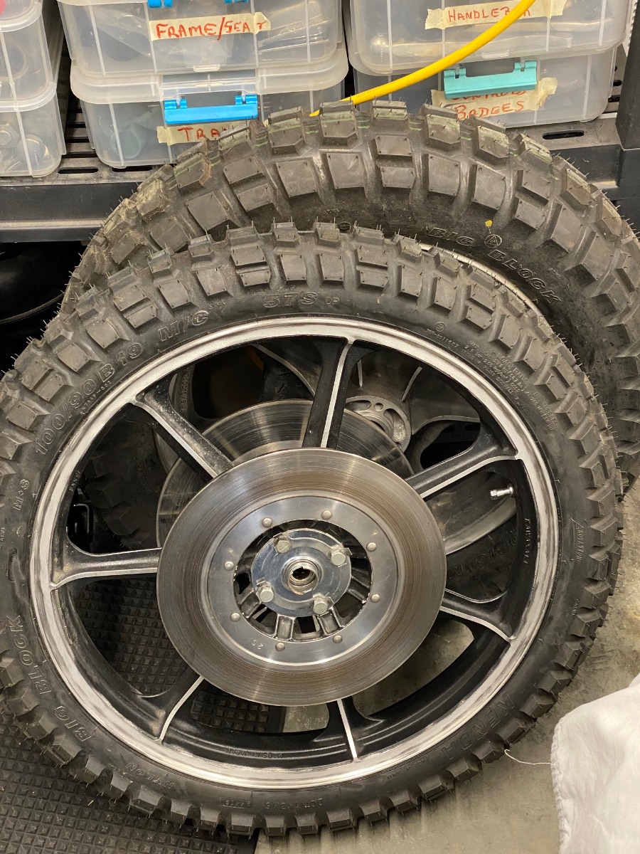 Welcome Koala! I recently acquired a 650 SR and am rebuilding it slowly. These were the tires the PO had purchased for the bike. The rims were painted black but he had painted without cleaning them so I stripped the paint off and cleaned them up. I also acquired a nice set of spoke rims that he had also painted without cleaning, including the spokes. I stripped them and was going to use them on this build but I do a fair bit of gravel roads so I think I'll try the tires in the photo.