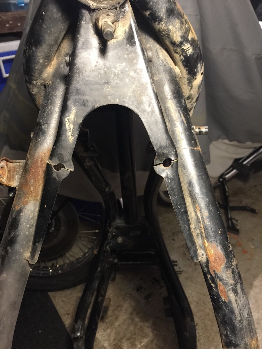 This is an example of what Steve was speaking to. You can see that both bolt holes for the oil cooler have cracked. On the right side (left side from rider position) you can see how the crack went into the frame and was almost all the way around the downtube.