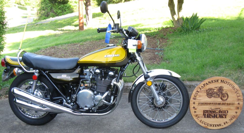 We had gone to the event & chosen to enter our Z1 for fun, not expecting anything in the way of awards. We're not trophy hounds anyway. We just like the people & the bikes & the ambiance at events like this. The opportunity to participate and support K9's For Warriors, to see old friends from VJMC along with so many fine old & rare bikes is always satisfaction enough. When the award for best Japanese bike in show was to be announced, we fully expected that a particularly fine, early sandcast CB750 K0 we looked at would be the winner. Instead, we heard “Best Japanese bike in show - 1973 Z1” and our names! Stunned, we joined Mr. Carini in front of the Golf Hall of Fame Museum to accept what turned out to be a very large wood plaque. The award plaques were produced locally by a shop that was in attendance in the vendor area. The pic below is in our driveway after we arrived home.