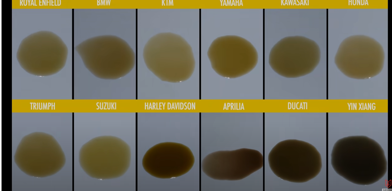 I think it was more that all the bikes tested were "brand new" and the colour of the oil is a indication of the residue of... crap that was left over in the machining/building phase of the engines, all the oil was the same oil just ran in each bike for a set amount of time and then drained out to be tested. The Chinese obviously broke the machine with the crap that was left inside the engine after production.