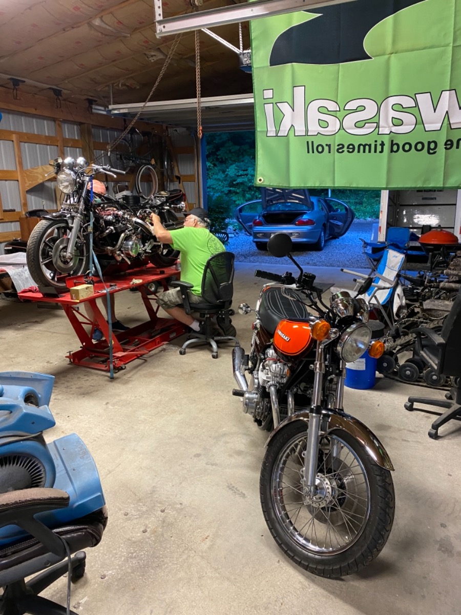 Jim (Wheelhop) bought a bike that had had some serious backyard mechanic treatment. Everywhere we looked we found something loose, backwards, or out of proper adjustments. We were able to knock out some of the more serious items, and got it running. Now comes the hard part, tuning and fine tweaks to get it back to it’s former glory. It was a nonstop day and a half of discovery and corrections. Even as we were wrapping up last night I noticed the front axle clamps were on backwards and the gap between the clamp and fork lower was incorrect. I’d seriously say that bike needs a complete front to back in-depth once, even twice over before is goes on the road. It’s a beautiful bike but a poster child for the unknown. New buyers of these 40+ year old bikes really need to do more than putting gas in the tank and getting them started. There could be a serious time bomb waiting to go off and seriously hurt you.