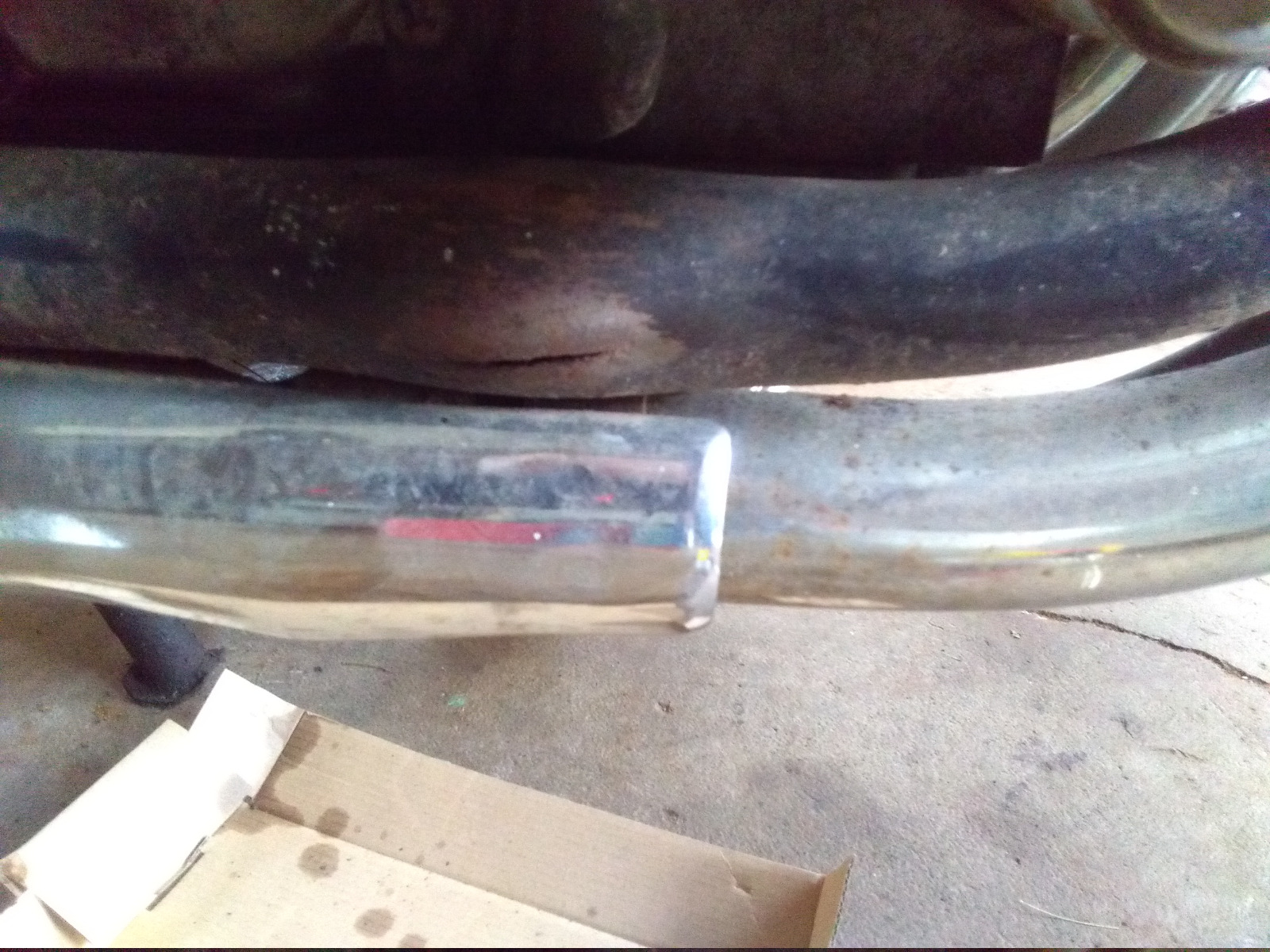 I'm glad that I haven't invested any money in this beast except for spark plugs and an order made yesterday that I should be able to return, because I think this project is coming to a screeching halt. That's OK, I learned a lot and have an extra set of carbs and learned a bit about these 650s now. I went to loosen the muffler and found a crack/split in the frame. Now I guess I can go ahead and safely pull the carbs and get them ready for the B1 that I am suddenly a lot more motivated to get.