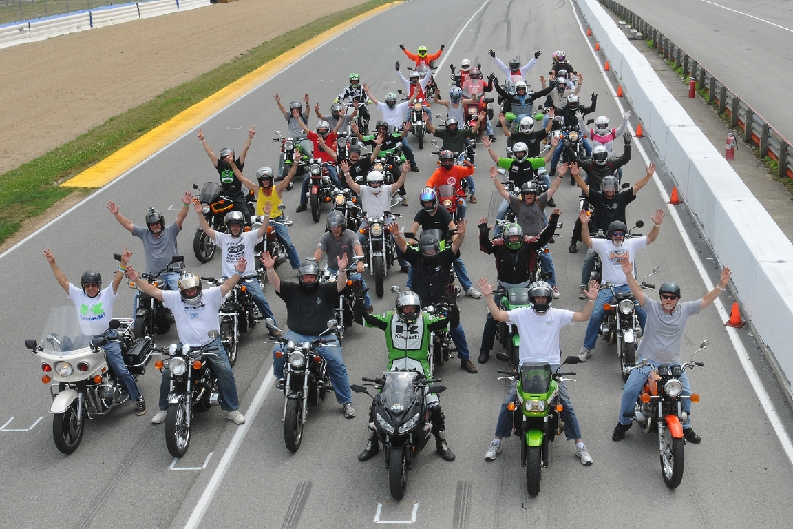 Here's a pic I found on the AMA site of the Kawasaki riders lap of the track during the AMA Vintage MC Days. They stopped us on the front straight to snap this.