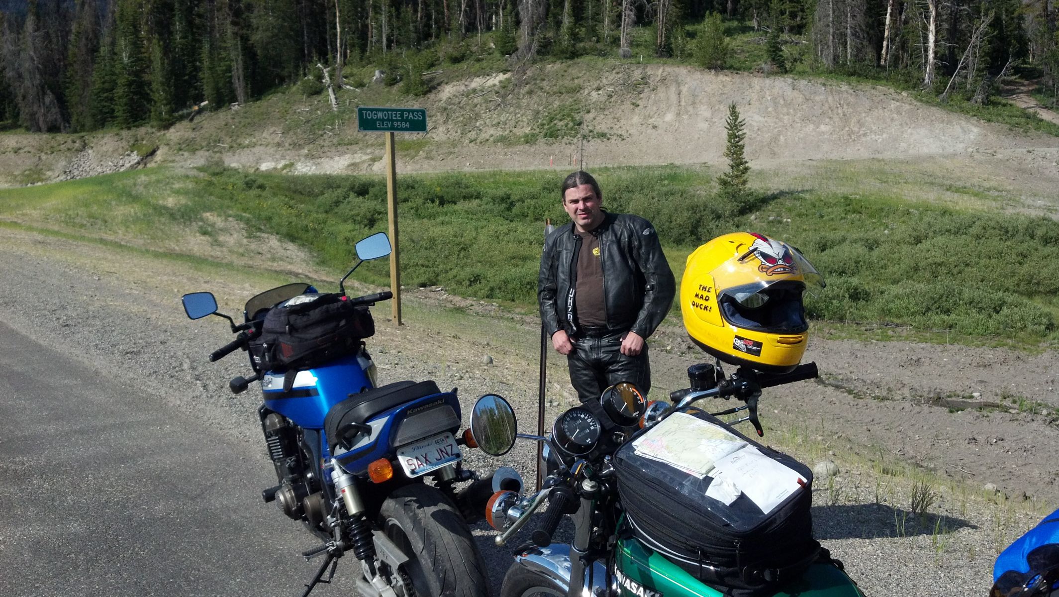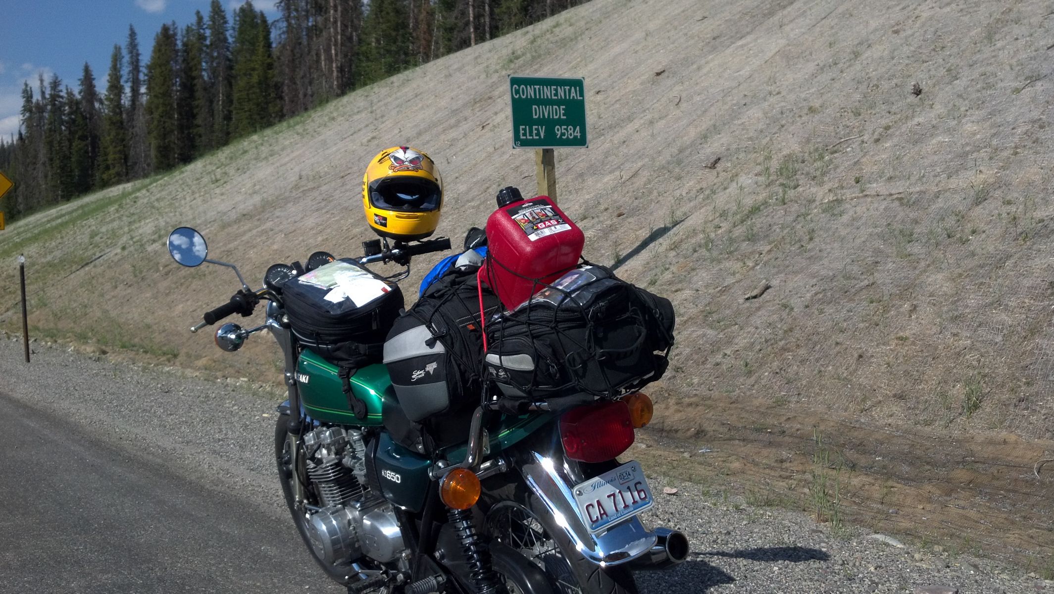 More Photos from Our KZ Relay Ride on 7-26-13: We left Dubois, WY and experienced a small issue and had to return to find something that fell off Jonz's bike. We found what we were looking for and proceeded up the Tetons toward Jackson and Yellowstone. We went through Togwotee Pass and crossed over the Continental Divide! Both elevation signs indicate the same 9,584 feet, a coincidence? I think not!