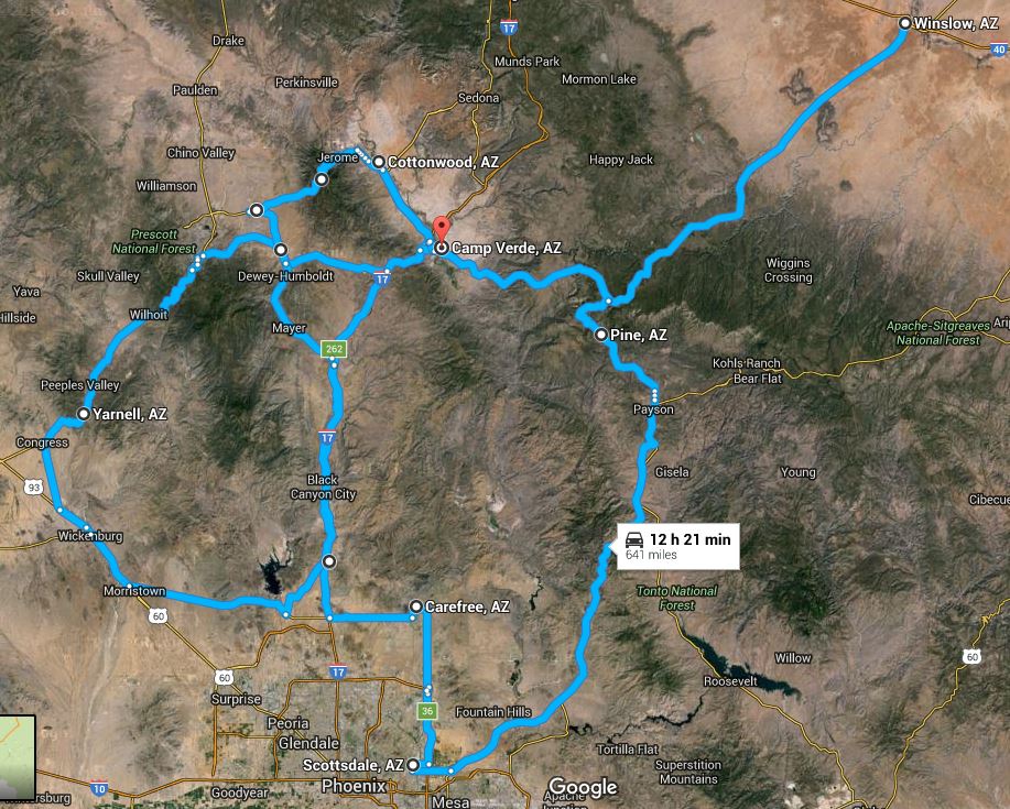 4 days were spent driving and another 4 visiting family but we still managed to put 700 miles on the bikes on some very nice roads between Winslow and Scottsdale