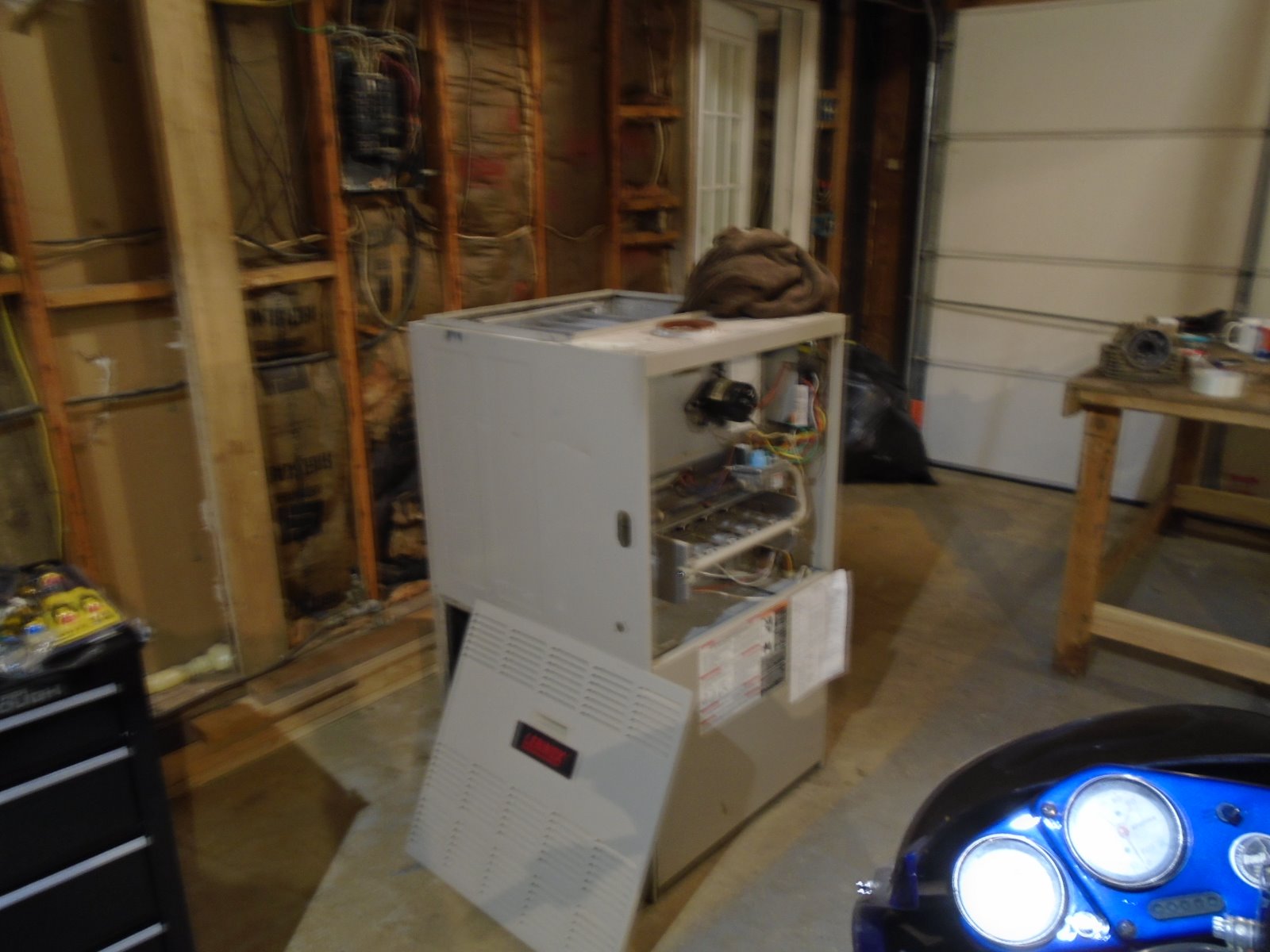 Just adding in on the charm of changing weather. Since the move I Miss my heated garage!! The new place had a rank amature carpentry job on rafters/support beam. Got that sorted now waiting on the electrician to bring wiring up to code then insulate and drywall. Pleasure chatting with the persons that responded to "parts for sale" but still haven't had to time/space to sort thru the boxes of stuff yet. I cannot spread out items on the garage floor yet because i'll just have to pick them up again so they aren't in the way of progress. I needed a heater for the garage, paid the carpenter for an unseen heater and he brought this mammoth of a heater over. 125K BTU is a bit of overkill for a 550sq ft area. All my projects are in the heated mudroom, next to the Beer fridge. Note the 73