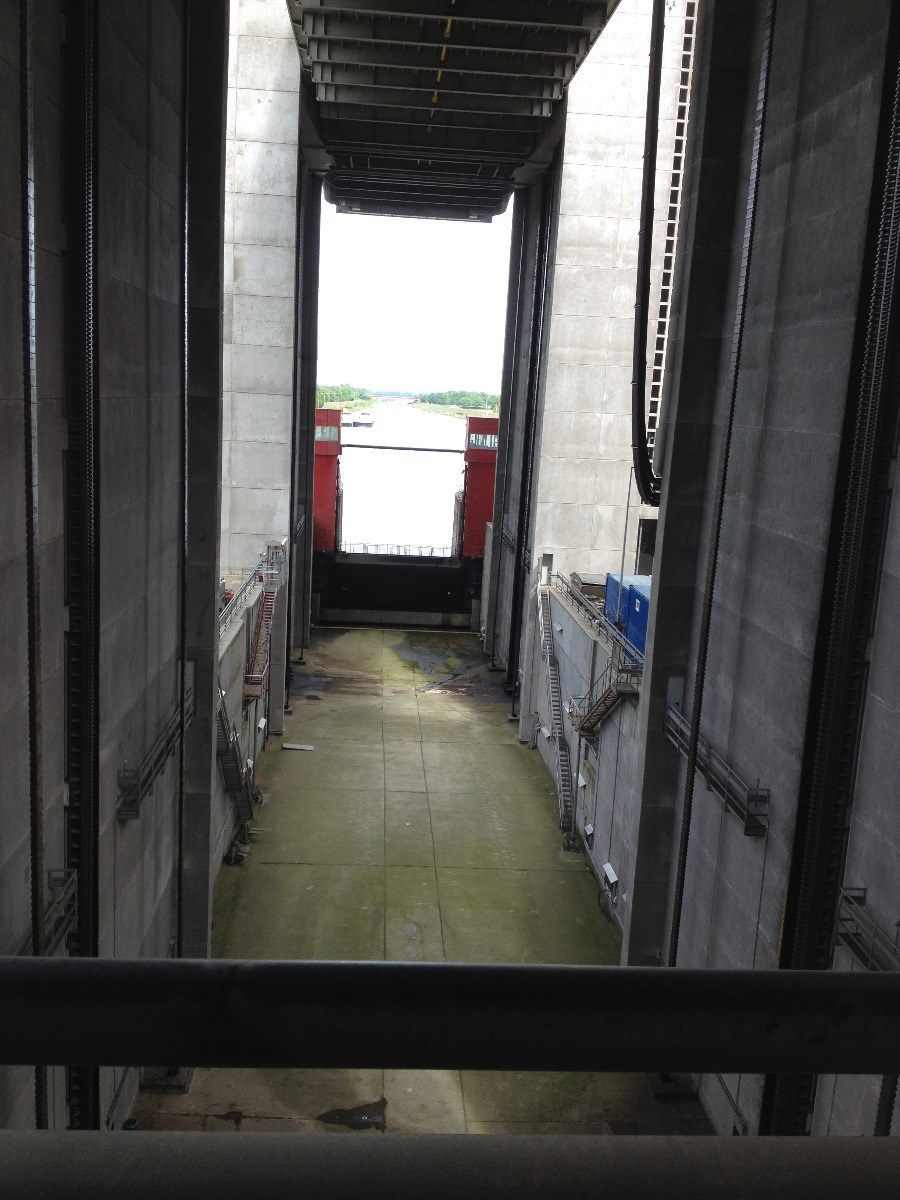 A ship lift is a structure used to lower or raise ships from one canal, with a height difference of about 38meters, to another that goes further vthis way. The ships remain in their "own" water during this process!