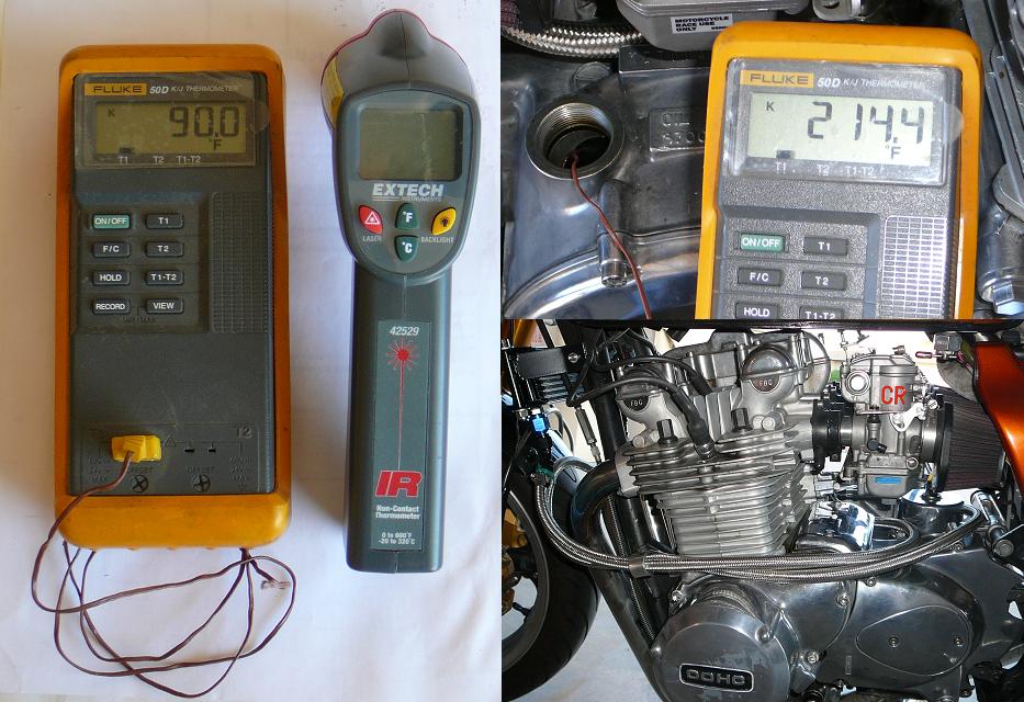I use a Sunpro mechanical water temp gauge with the probe mounted between 2 of the head cooling fins. I also have an oil pressure and oil temp gauge.On a hot day ,my bike runs 200 to 210 degrees oil temp and 180-190 cylinder head temp. I also have a large Satrab oil cooler and a belly pan that ducts air underneath the motor.Just as a reference point for u.Hope this helps.These old bikes do run hot in the summer.I can touch the exhaust pipes long before I can touch the engine after a ride.The oil gets hot and stays hot for a long time.Thats why good oil is so important.bj