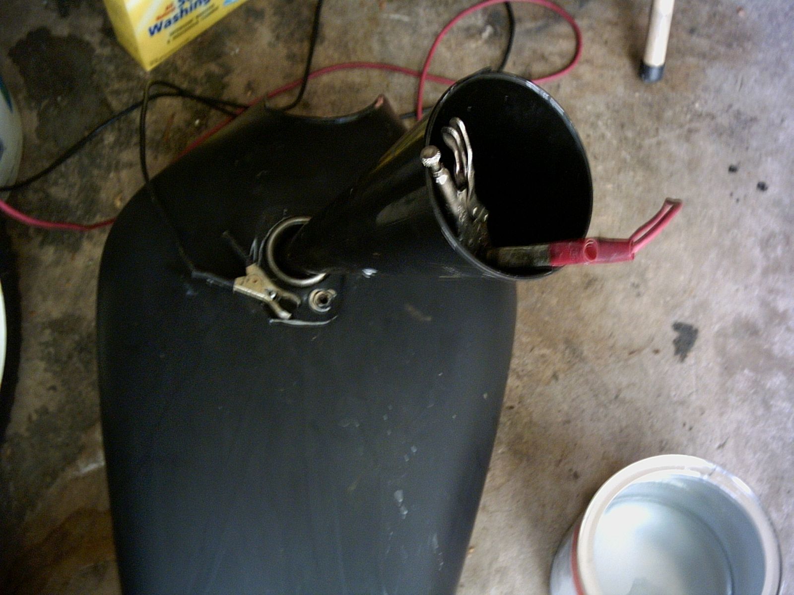 There is a piece of re-bar going down inside the plastic funnel, keeping it insulated. The depth is set off the bottom about an inch. the vice grips hold it there. The re-bar has about 4" exposed from the bottom of the funnel, this exposed section is where the transfer takes place. The water keeps coming out clean, but there is still scale attaching to the Cathode= re-bar, so continue to treat. I have the petcock and the Fuel Sending unit removed. i plugged the hole for the sender with a tool I already had, a Block off plate from my Two Stroke Crankcase tester. The petcock, well i have just been placing a fresh piece of Duct Tape over it each water replacement. So far only twice has it decided to leak from there.