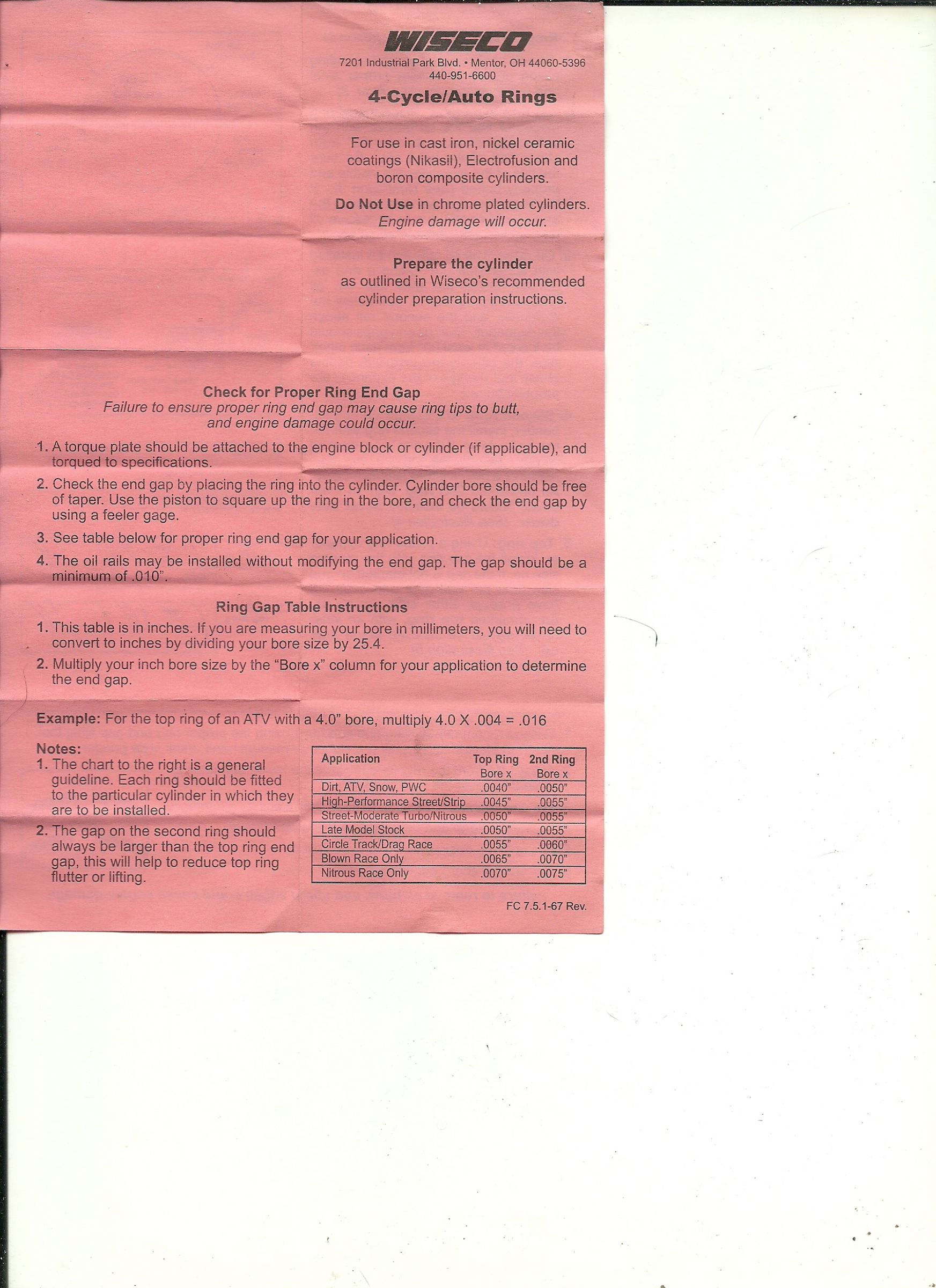 Dont know but I just put the rings back on the pistons inn the following manner. The one that had no markings and the bevel to it is inn the second spot with the bevel facing the crankcase. the one with the word TOP on it is in the first spot with the TOP facing up toward the head. Also, why the low compression with new rings and fresh honed cylinders? Nice 45 degree hash patterns too. doesnt make sense to me.