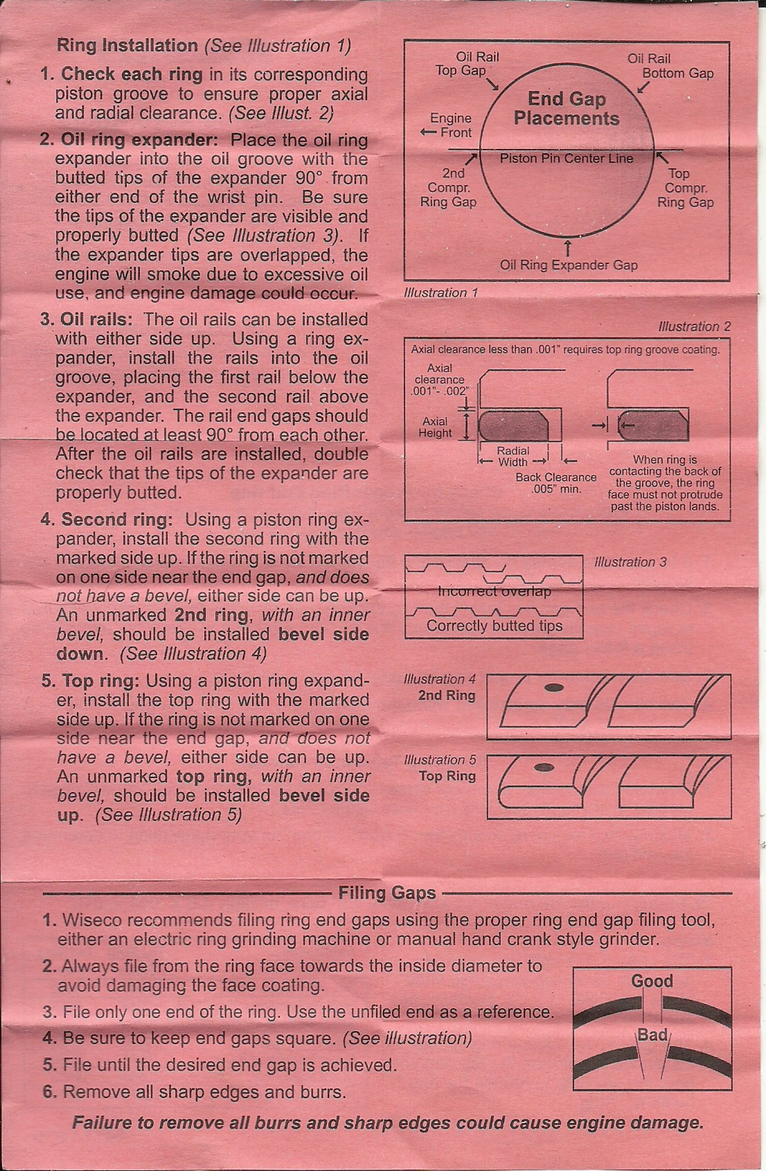 Dont know but I just put the rings back on the pistons inn the following manner. The one that had no markings and the bevel to it is inn the second spot with the bevel facing the crankcase. the one with the word TOP on it is in the first spot with the TOP facing up toward the head. Also, why the low compression with new rings and fresh honed cylinders? Nice 45 degree hash patterns too. doesnt make sense to me.