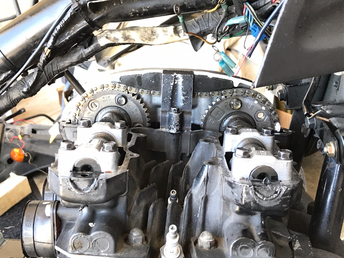 Mark is still using the stock air box, but might not be for much longer, as I saw him fight to reinstall the carb rack. Throttle cables remained attached to the carbs, but moved the carb rack off to the left side to gain access to the manual cam chain tensioner.