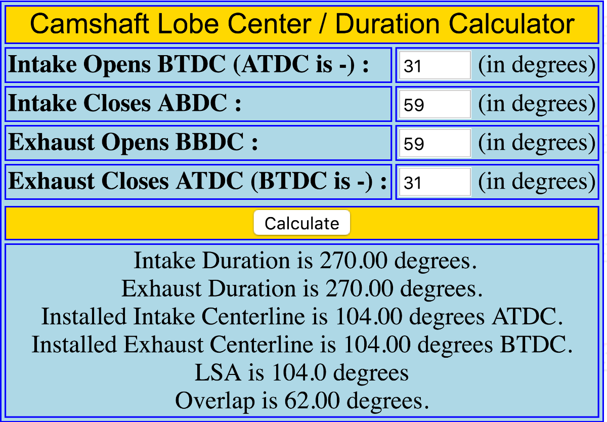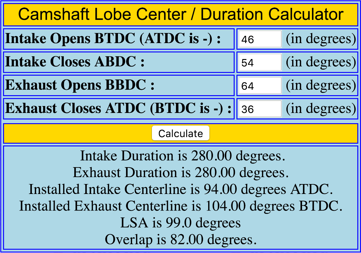 For example, if we use .050" as the lift, I measured the duration as 227 on a two-groove (Zr) camshaft. The centers are still 104/104. Then we have: