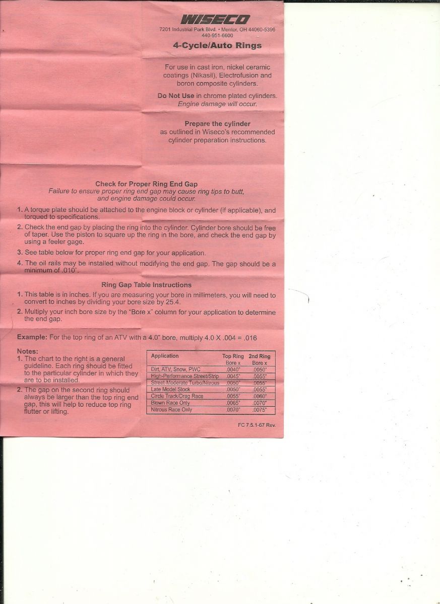 The paper work with the Wiseco kit will have info on piston clearance and ring end gap.