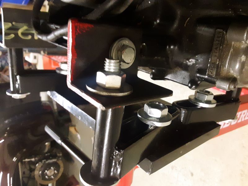 Recently came up with a simple mount arrangement for an engine stand. Used a (relatively) cheap harba frate stand and made some angle brackets from L2x2x3/16 angle, drilled holes on each leg. (there will be 2 LH and 2 RH patterns). Bolts thru engine mounts, 1 upper and 1 lower, are 3/8-16 (couldn't find 10mm bolts long enough at local hardware store). Cut a couple of spacers from 3/8 sc40 pipe. Had to buy bolts nuts and washers long enough to bolt thru the tubes of the mounting ears, too. Works pretty slick.