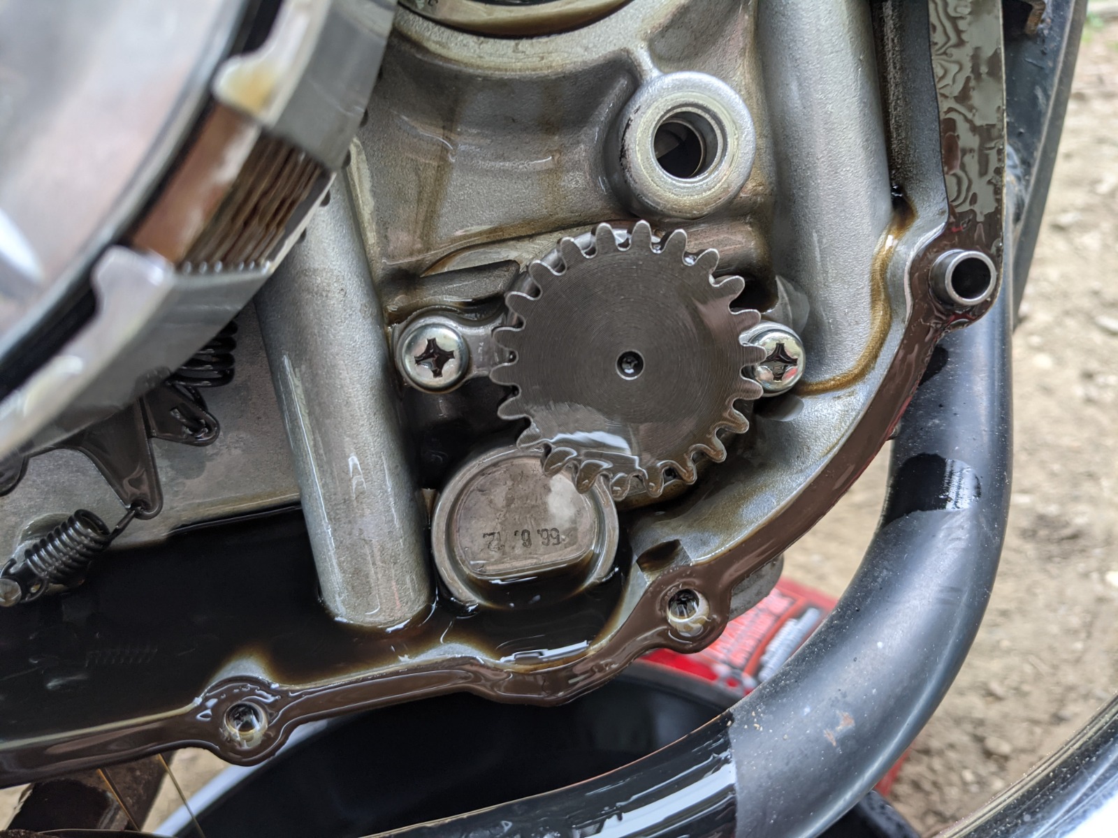 I think I have it figured out - I'll try to get myself into it tomorrow to get some good pics for you. The general idea is removing the clutch cover (and gasket) as well as the timing cover on the opposite side, then using a long object tapping out the aluminum plug described in the article I shared last week. I've circled the spot that the long object goes into, but I haven't been under the timing cover on my bike, so pics to come.