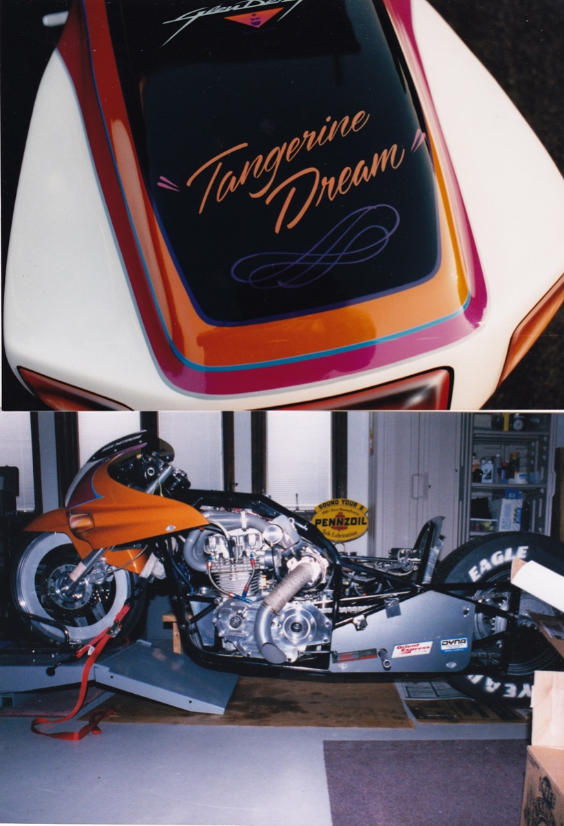 In a former life - KZ-based dragbike - CrMo car tire chassis, 1395cc, Hahn Racecraft turbo system, VP C16, Orient Express 3-spd auto, 7.80's @ 165-170.