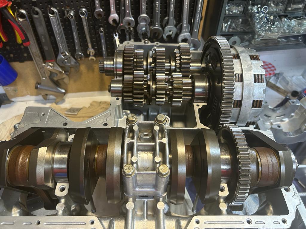 I have both halves of the engine ready to assemble. One holds the gearbox and clutch (and crankshaft etc.), and the other one holds the gearchanging mechanism.