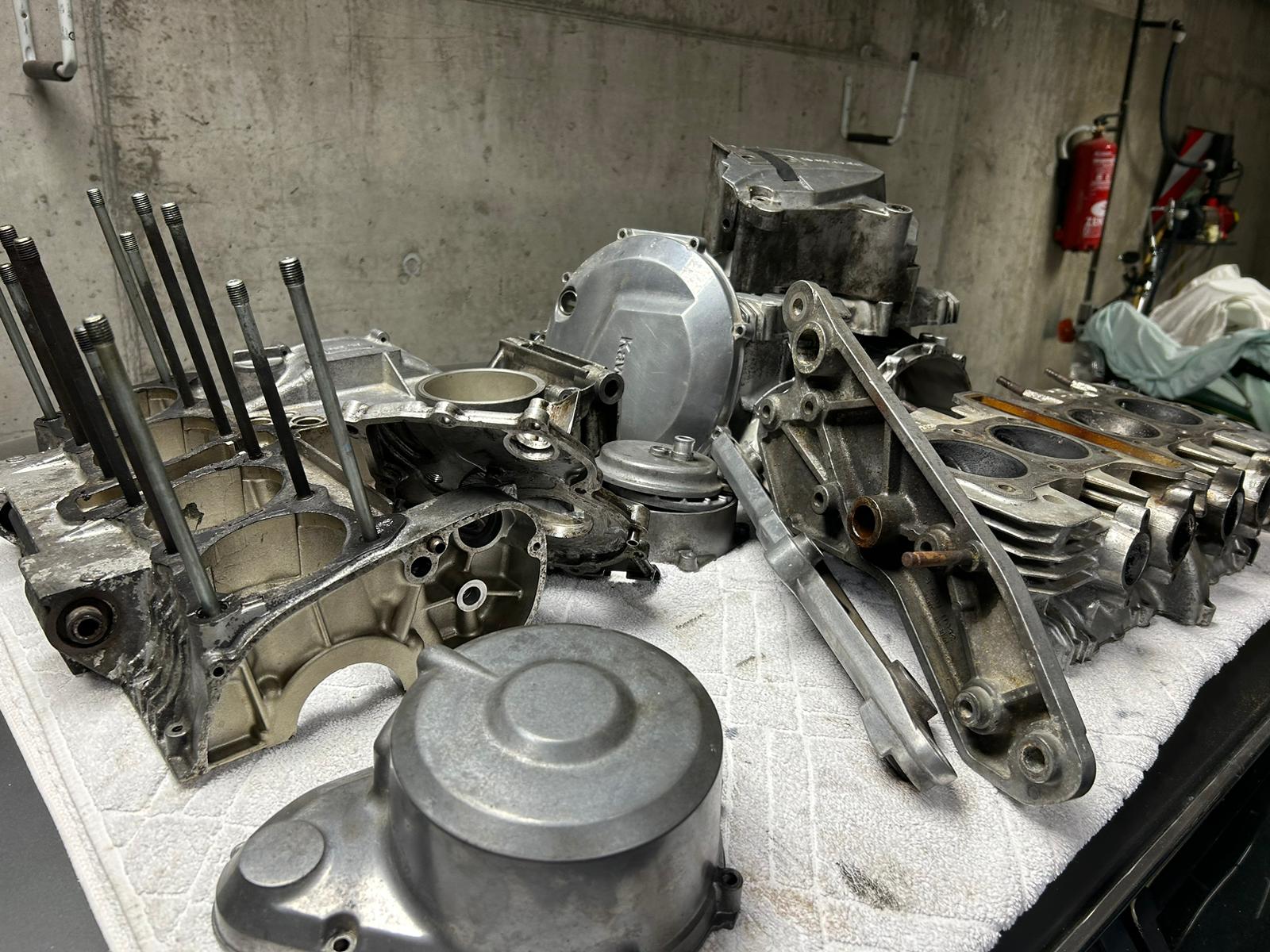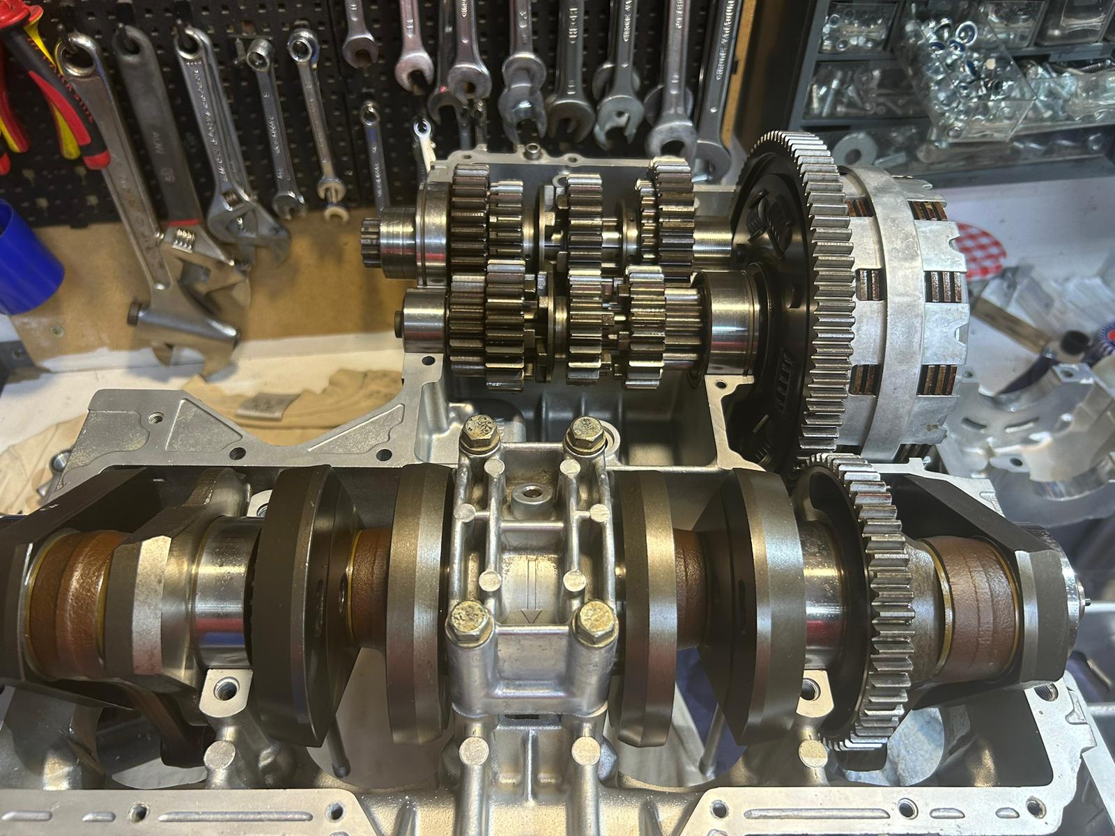 - Assembly has begun. Crankshaft in place, new cam chain in place (original was a bit stretched)... all in a superclean engine. Happy!