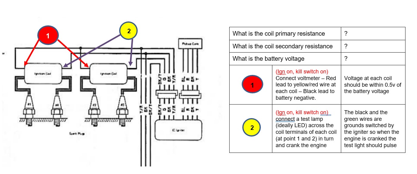 27 Jul 2023 01:28 - 27 Jul 2023 01:28It's not clear what you are testing here and how? I would suggest you follow the below and let me know what results you getHey guys, I've done some research but I'd like some fresh eyes as I'm frustrated. 83 kz550m1. Complete fresh rebuild on carbs and had the valve cover off to check valve lash prior to the issue. It's misfiring for sure. I have yet to even sync the carbs and adjust air screws but I did do a visual syncing the throttle plates. When is running and i pull the plug wires off one at a time, cylinders 1 and 4 change the rpm very slightly but I am getting spark. Plug wires 2 and 3 will kill the engine when pulled off. I checked cylinder 1 and 2 plugs and 1 is wet while 2 is dry. With the good spark coming from one coil and the weak coming from the other, I'm thinking I've got a bad coil but resistance measurements are the same on both.