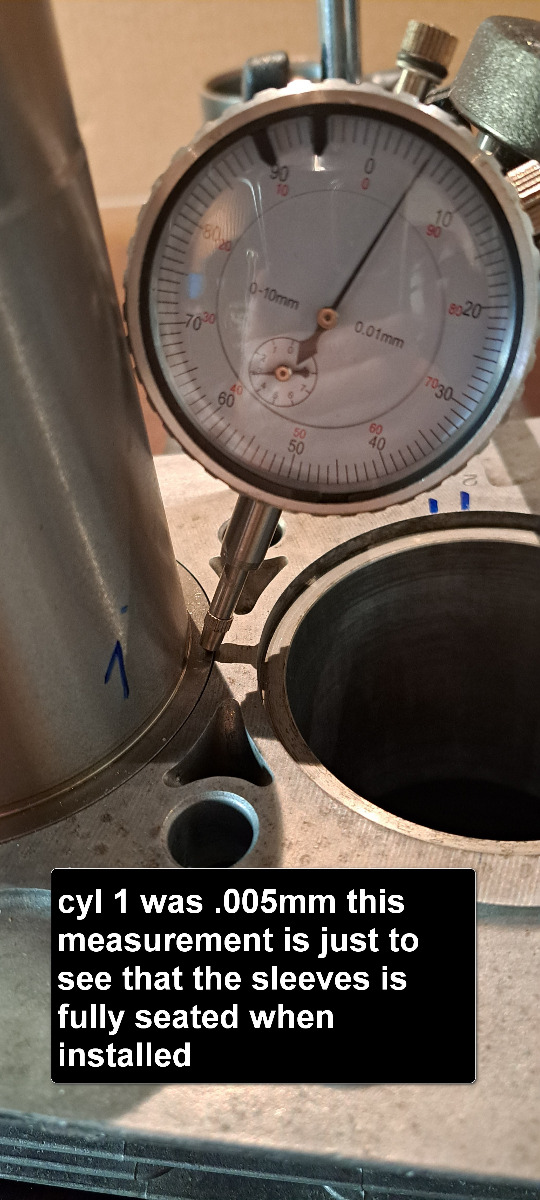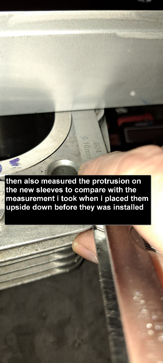 .I have started to measure the protrusion on the new sleeves just to check that the sleeves are fully seated after installed.I need advice because when i honed the old sleeves one of them (cyl 3 ) started to spin in the boreIt is not very loose and when block is in room temp the sleeve has a tight fit and i can not push it out by hands.The plan is to buy some loctite sleeve retainer and use that before installing .Is that needed ? when thinking about it the cylinderbarrel gets really hot when engine is running and all the sleeves will then only be secured by the pressure from the bolted on head.? But i will use the loctite sleeve retainer fluid anyway because the sleeve maycome loose again when the machineshop going to bore and hone.