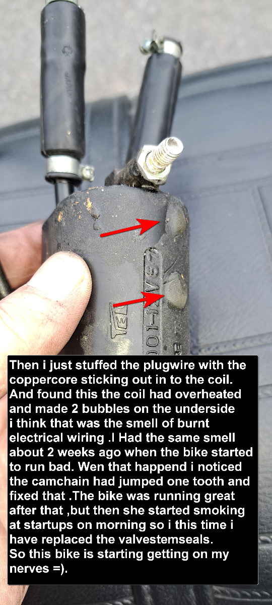 This time (yesterday) when i had finished replacing the valvestemseals i did the testride and it ran fine to begin with ,but i then felt a little hickup or thump from engine right before it started to misfire and run very bad and also smelled burnt electrikal this time.I dont know if it is possible to feel the camchain jumping ,but i think that is what has happened again